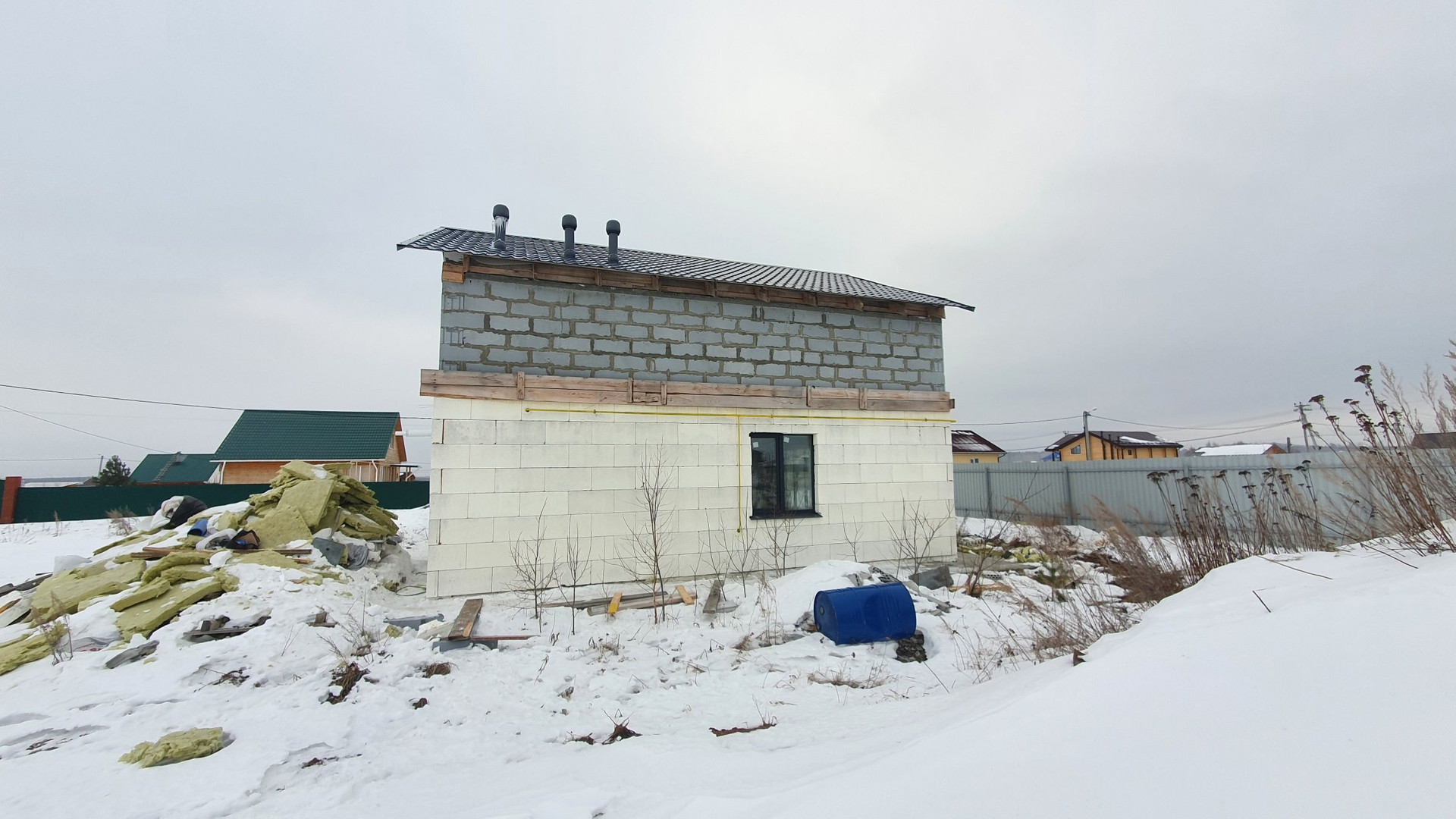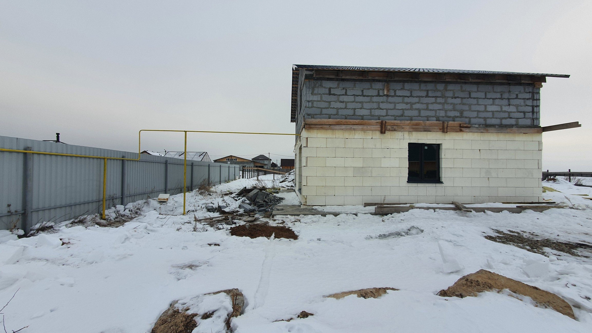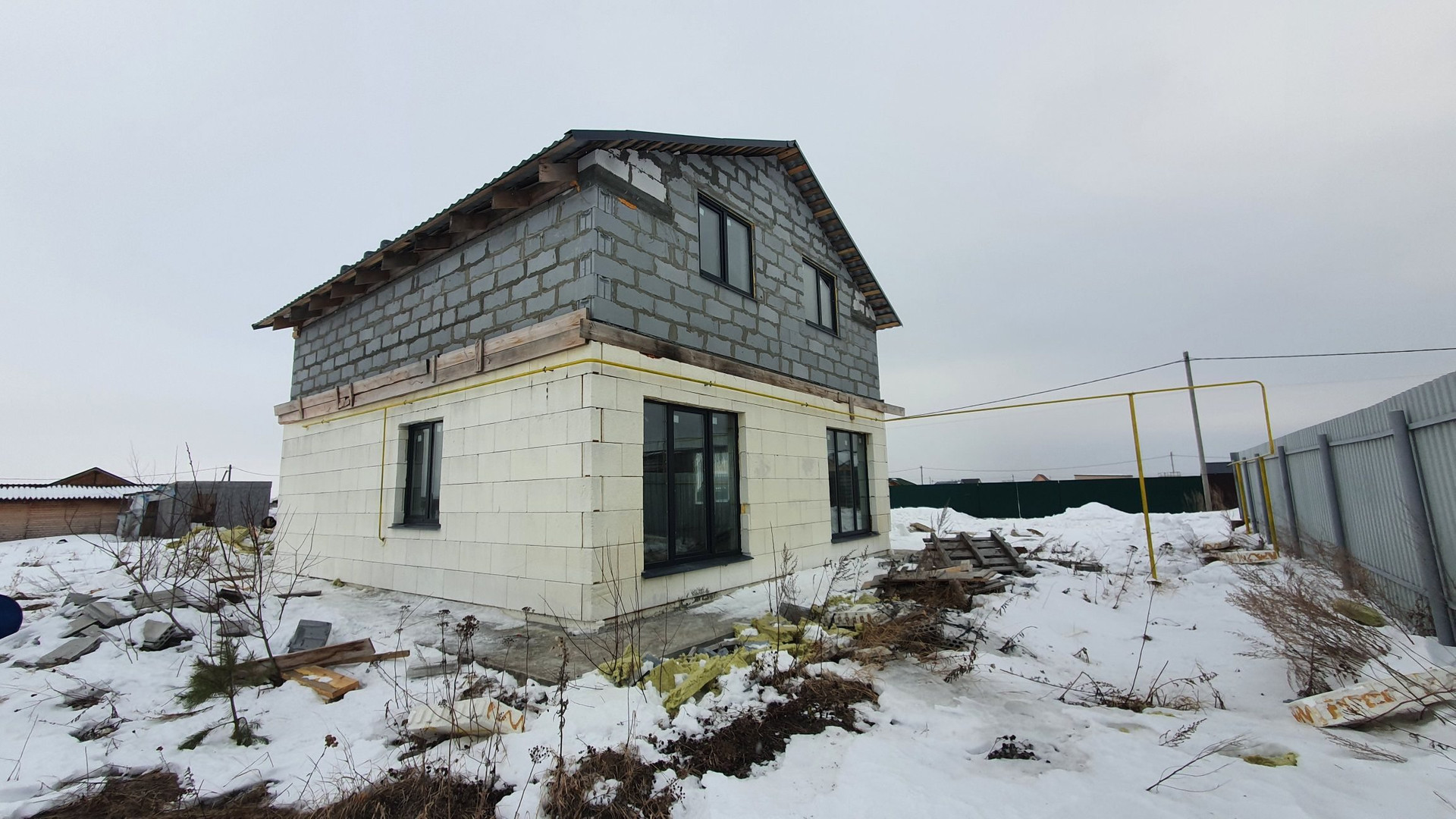 Стены первого этажа монолитные с утеплением. Стены такого дома простоят века без дополнительных затрат. Второй этаж выполнен из твинблока. В дом заведены коммуникации: электричество (15 кВт), газ (варочная поверхность и двухконтурный газовый котел на отопления и ГВС) скважина (насос глубинный в скважине, бесшумная насосная станция в доме, чистейшая вода), канализация (септик), дополнительно установлен электрокотел на отопление (9 кВт). Отопление - теплый пол. (теплоноситель-этиленгликоль). 1 этаж 64 м2 (прихожая, кухня-гостиная, санузел, котельная). 2 этаж 64 м2 (свободная планировка).