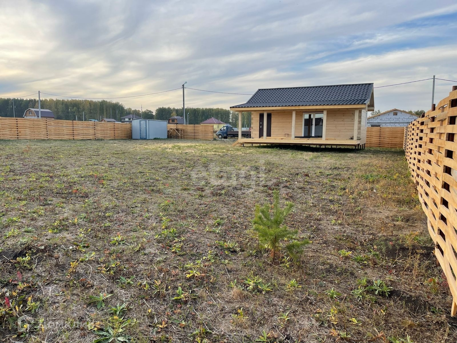 УЧАСТОК ровный, квадратный, чистый. Огорожен деревянным забором по периметру. Имеется скважина; вкопаны жб кольца под септик, электричество 9в дом не заведены). Поселок газифицирован