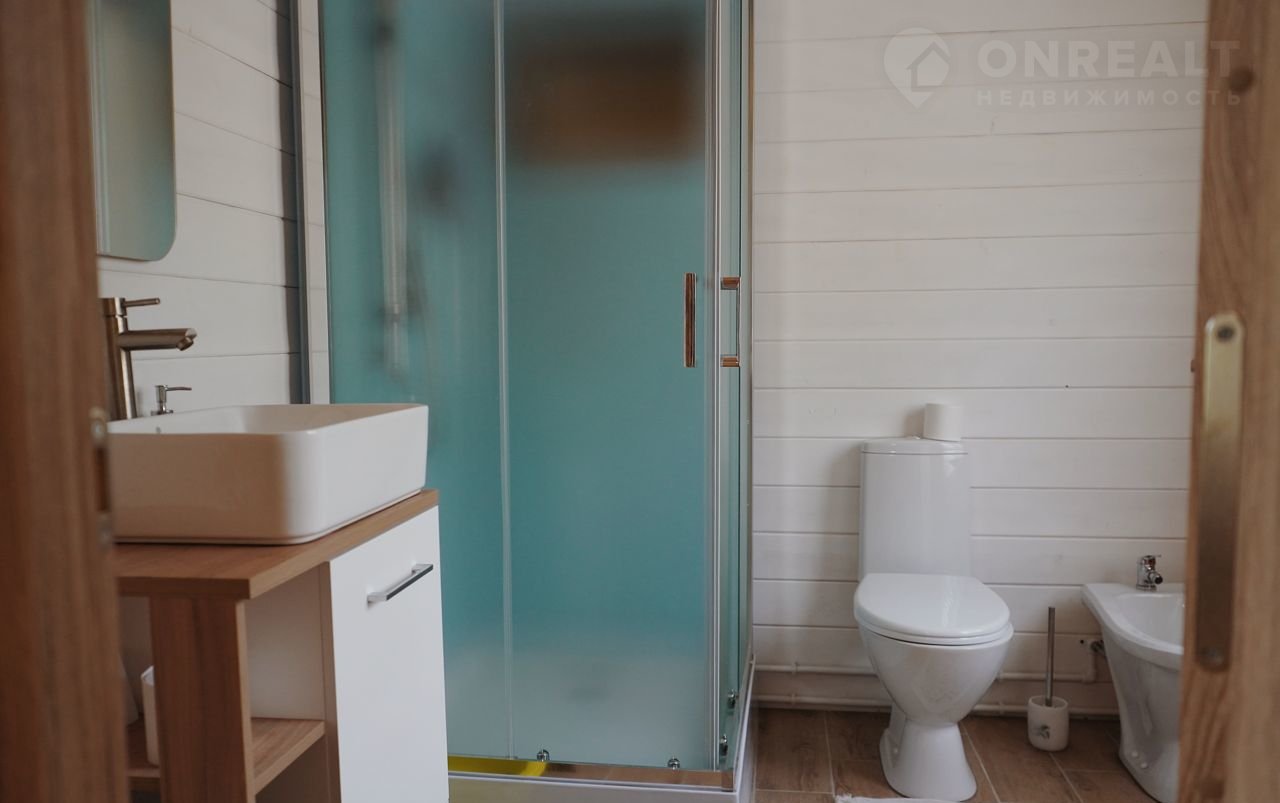 Ламинатные полы, стены обшиты имитацией бруса. Натяжные потолки с точечными светильниками. Яркое освещение создает уют в доме даже в пасмурные дни! Установлена современная сантехника: унитаз, душевая кабина, умывальник. Также установлен водонагреватель, автоматика для скважины. Произведена разводка электрики и центрального электрощита, водопровода, канализации, конвекторов. Дом очень теплый, что позволит экономить на отоплении зимой (15 кВт электричества, 3 фазы).