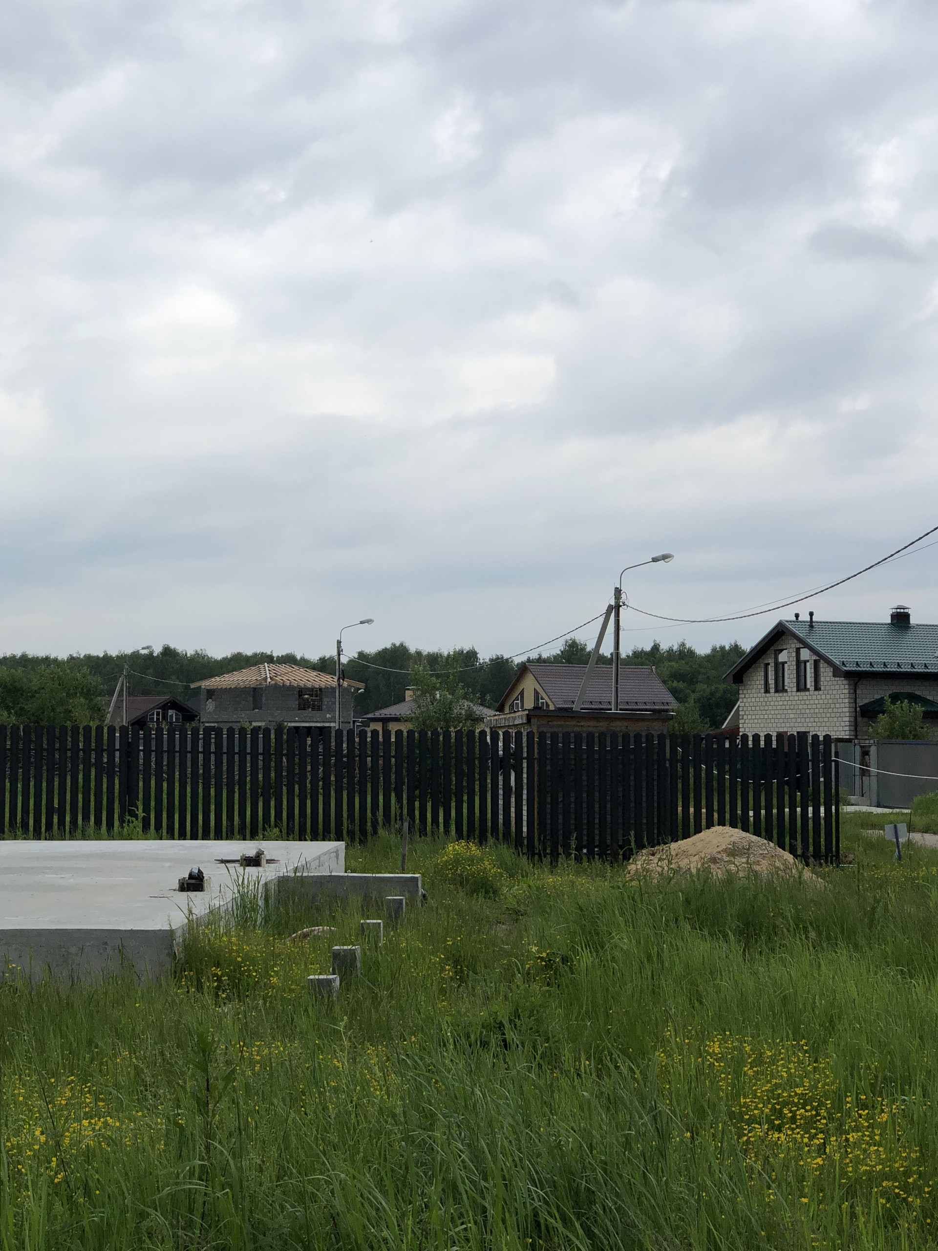 * На участке есть скважина на 58 метров, много сосен, построен фундамент под дом 10х12 метров, с закладными под коммуникации, плюс по трём сторонам забивные сваи под большую террасу. Фундамент свайно-забивной. Сваи 150х150х3000, ростверк 40х50 и залита бетонная плита 12 см толщиной поверх ростверка. Данный фундамент построен с большим запасом по нагрузкам.