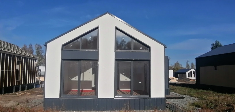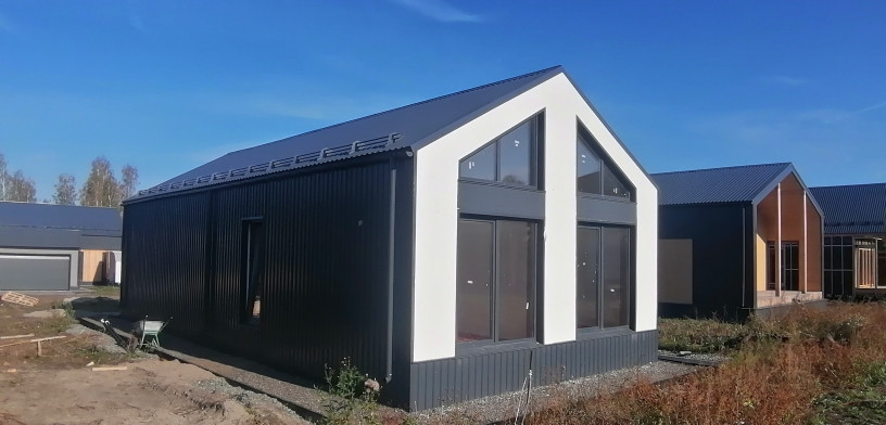 Отделка наружных стен материалом штукатурка, блок хаус и металлопрофилем. Водосточная система.