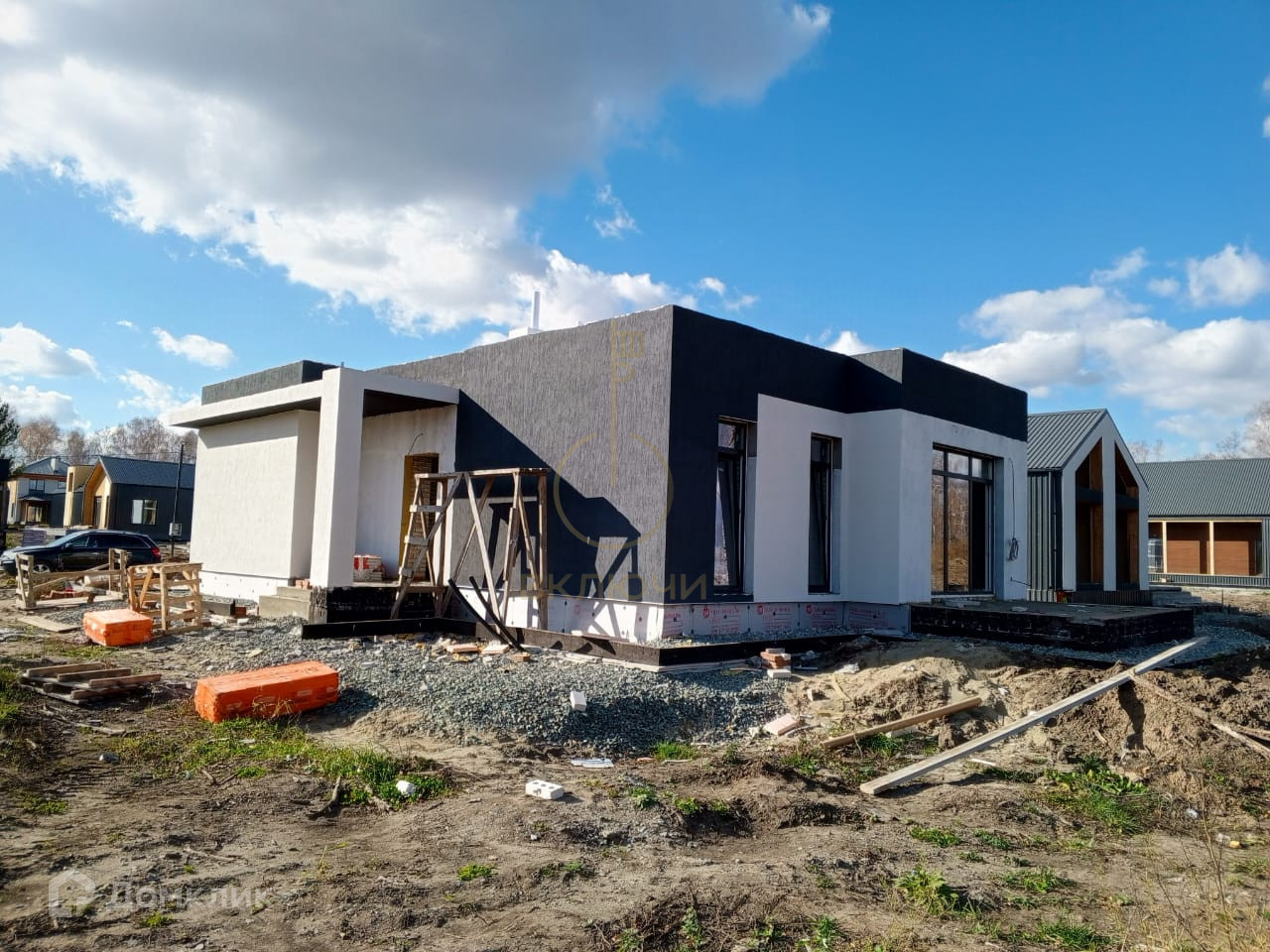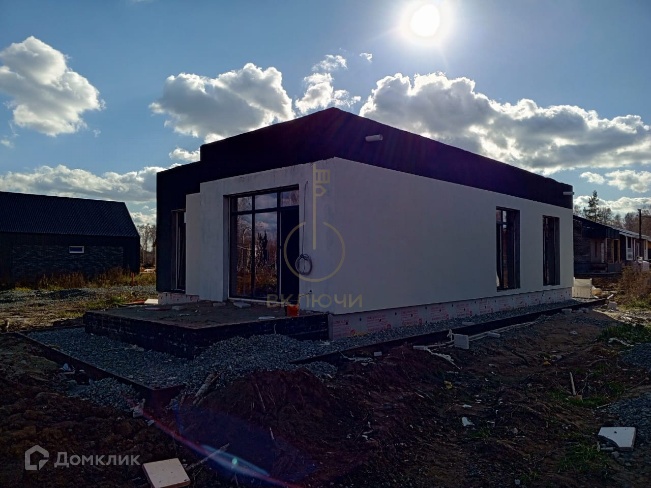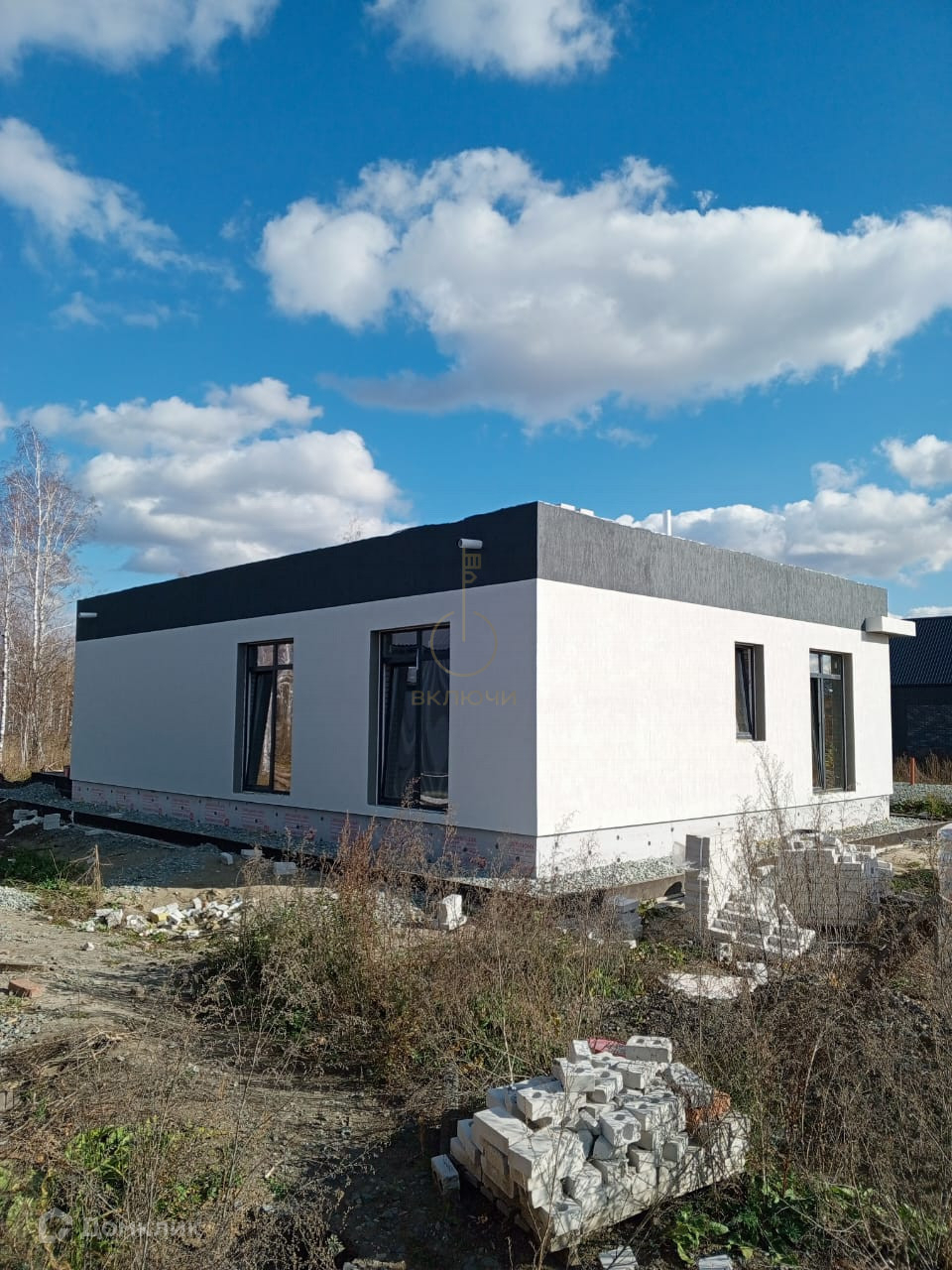 А так же дверь с терморазрывом, утепленная крыша с огне и биозащитой, остекление всего дома, водосточная система, подшив свесов и карнизов, закладные под коммуникации, водяной теплый пол, чистовая стяжка на полу, разводка коммуникаций под землей(газ, вода, электричество), электрический котел, оштукатуренные стены, перед каждым домом газон от застройщика, плюс заборы 1,5 метра в одном стиле.