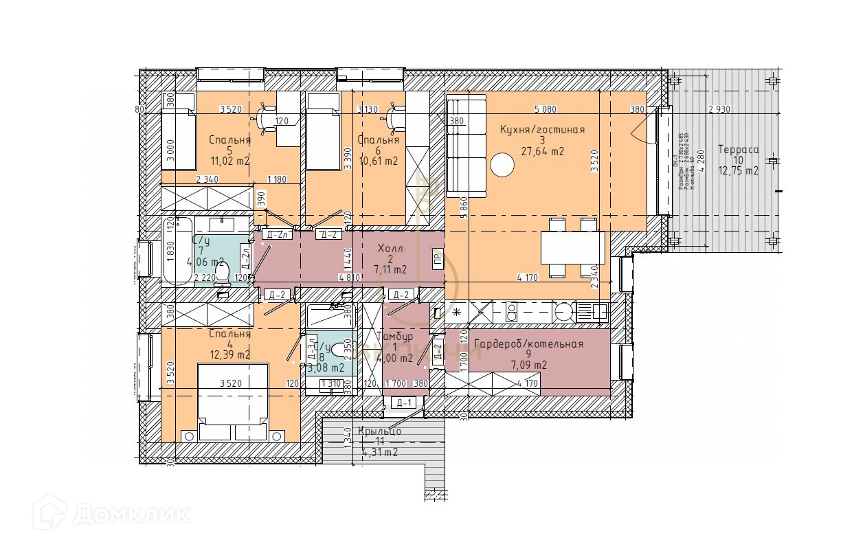 Три просторные спальни, кухня-гостиная 27м2, котельная, гардероб, два с/у.