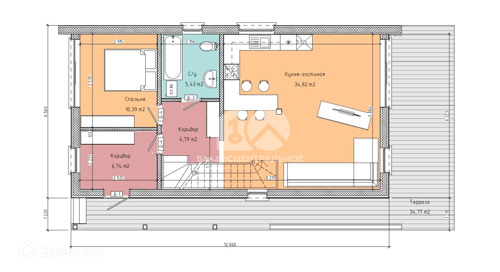- Первый этаж: прихожая, котельная, коридор, санузел, 1 спальная, кухня-гостиная, терраса.
