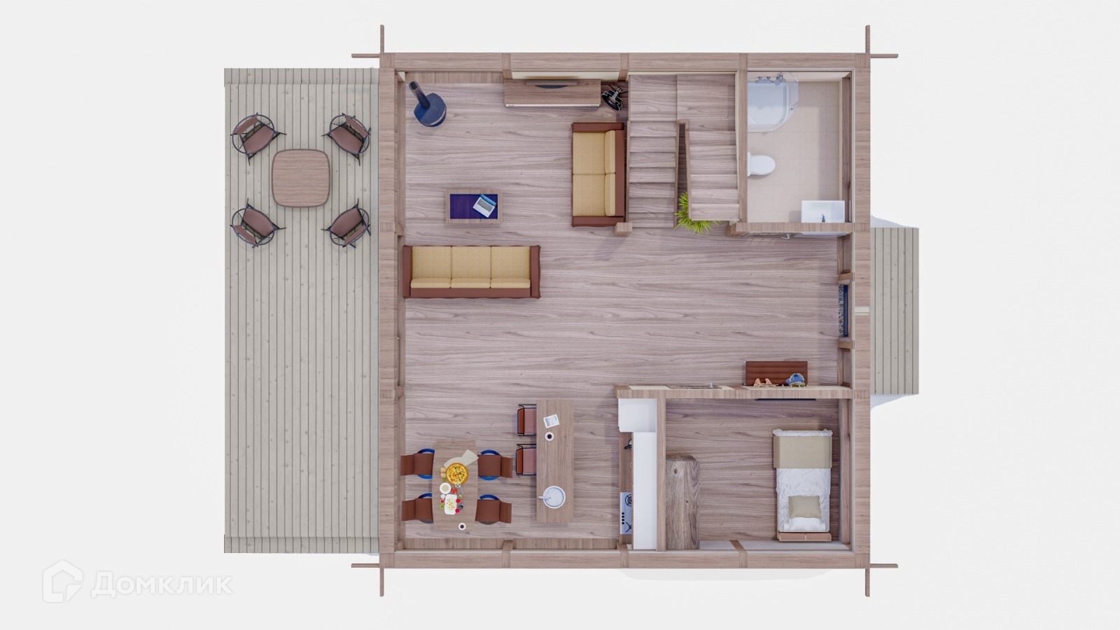 - Первый этаж: Кухня-гостиная 36 м2; гостевая спальня 9 м2; прихожая 15 м2; кладовая 6 м2; санузел 5 м2.