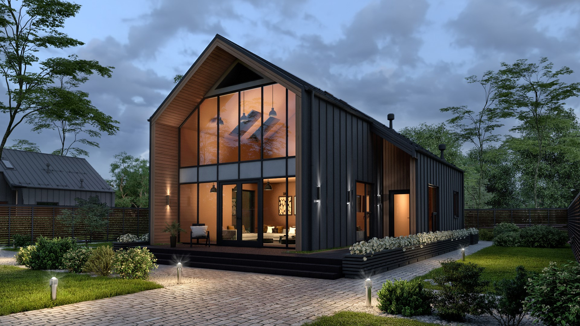 •    Отмостка из брусчатки по периметру дома.