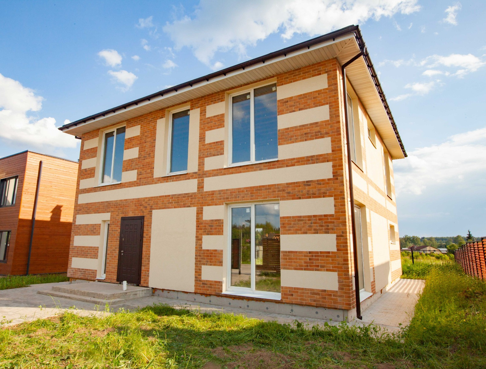 • Дом в комплектации "теплый контур" (фундамент, коробка дома, утепленная скатная кровля из мягкой черепицы, отделка фасада фактурной штукатуркой с комбинацией клинкерной плиткой).