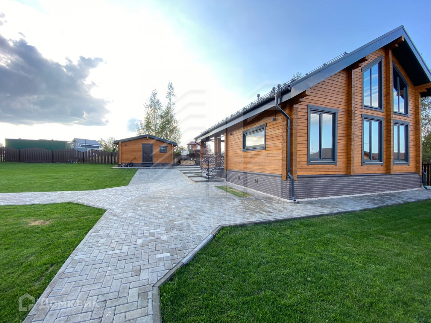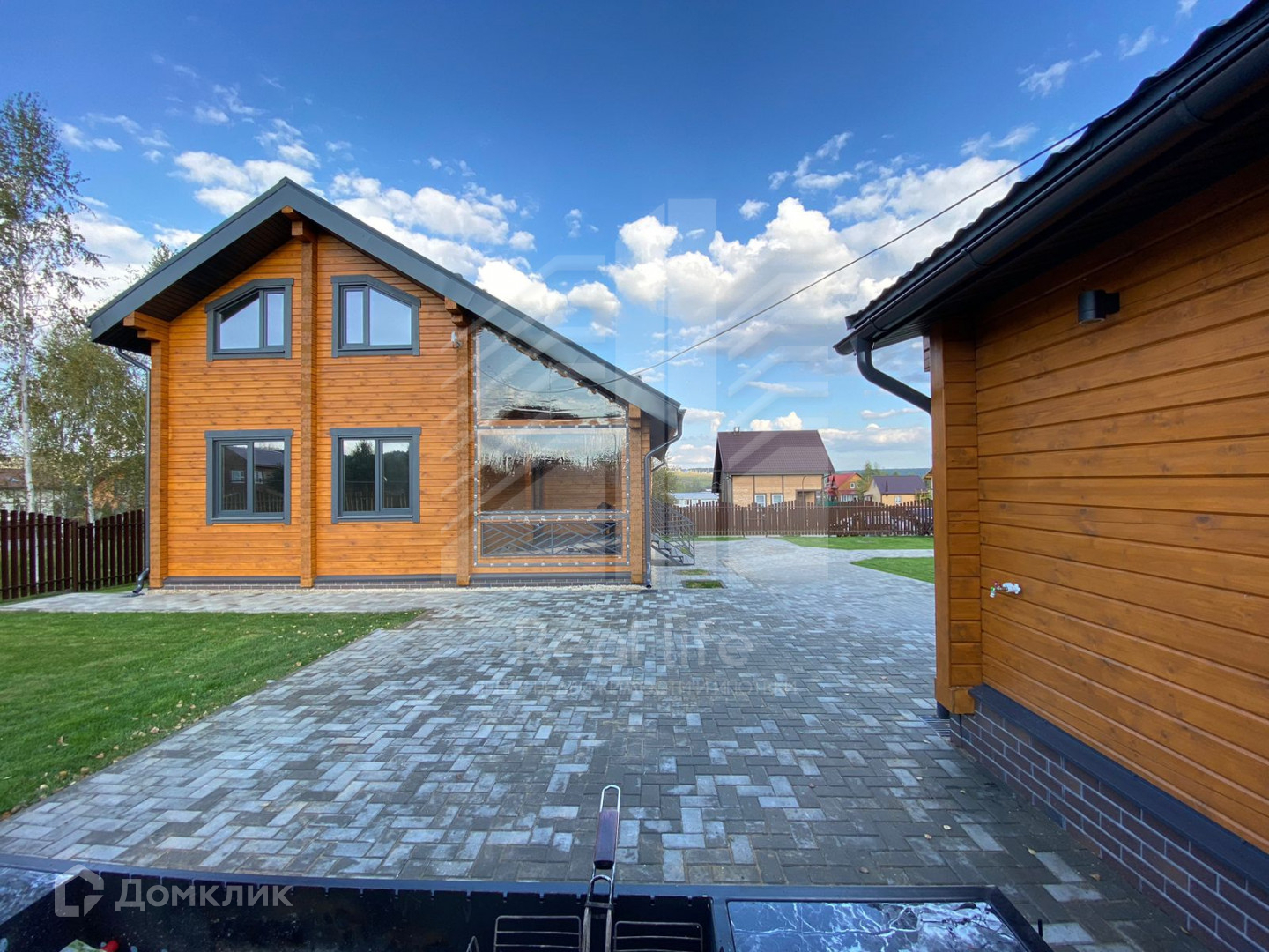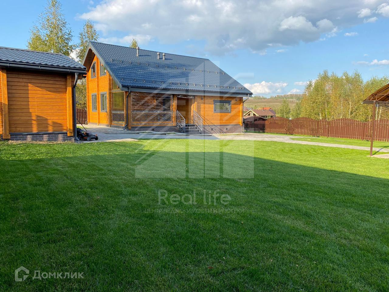Участок 8 соток, ровный, огорожен забором. Установлены откатные автоматические ворота, брусчаткой вымощены дорожки, парковка на 2 машиноместа, отмостка. На участке рулонный газон, сделана дренажная система.