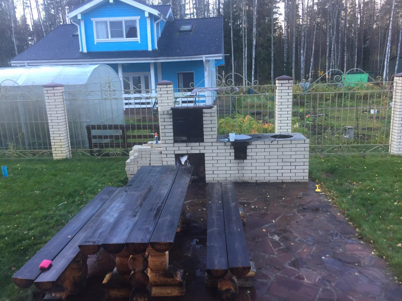 Забор холодная ковка с кирпичными столбами по периметру участка, дренажная система