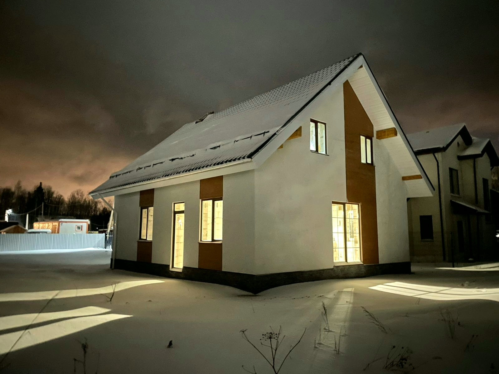 Двухэтажный дом с удобной планировкой и большой кухней-гостиной для круглогодичного проживания. Дом выполнен на фундаментной плите 25см, утепленной пеноплексом 100мм, с предварительным устройством придомовой дренажной системы. Стены выполнены из газобетона ЛСР марки D400 шириной 300мм, с утеплением каменной ватой RockWool Рокфасад 50мм и нанесением камешковой штукатурки Ceresit на армирующую сетку. Цокольная часть фасада выполнена из искусственного камня по слою утепления Пеноплекс 50мм с устройством цокольного водоотлива. Кровельная система дома выполнена с применением качественных изоляционных материалов: ветро-влагозащита Изоспан AQ Proff 188г/м2, пароизоляция Изостронг С 75, утепление RockWool ЛайтБаттс 200мм, кровельный материал-металлочерепица 0,5мм из оцинкованной стали с полимерным покрытием со снегодержателями. Перекрытие 2-го этажа выполнено из дерева, с несущими балками сечением 200*300мм. Конструкция двухкамерных стеклопакетов выполнена из профиля Rehau70 с комплектующими RotoNX, открывание выполнено в 2-х вариантах с опцией микропроветривания. Установлена металлическая стальная входная дверь с терморазрывом. Входная группа в дом выполнена в виде бетонного крыльца с 2-мя ступенями, по периметру дома устроена отмостка из бетона на слое утепления из пеноплекса 50мм шириной 0,5м. Так же на участке выполнена парковка на 2 автомобиля и пешеходная дорожка к дому из тротуарной плитки: брусчатка 200*100*80.