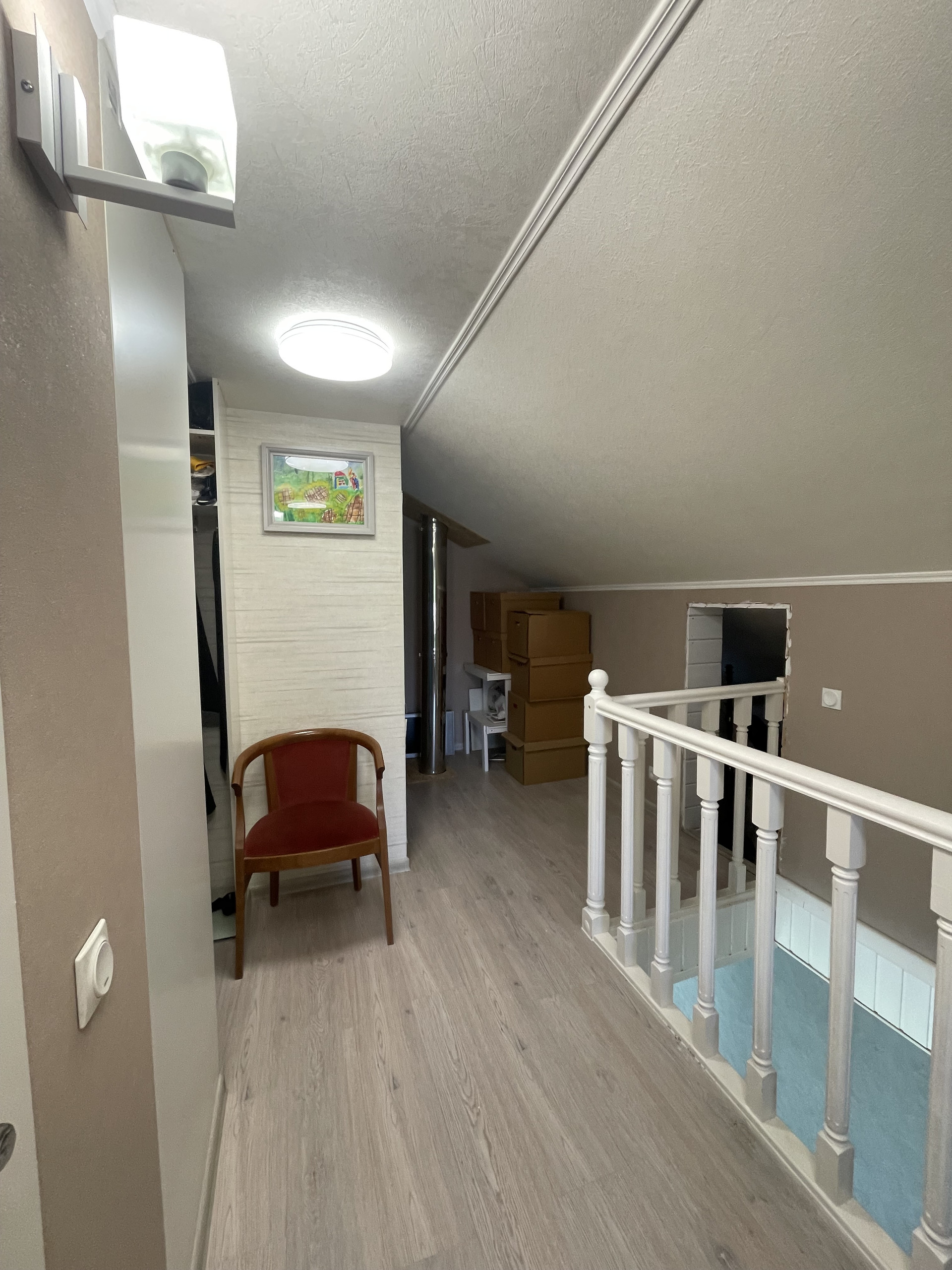 На втором этаже спальня с выходом на балкон, детская, сан узел с ванной, гардероб, кладовая.