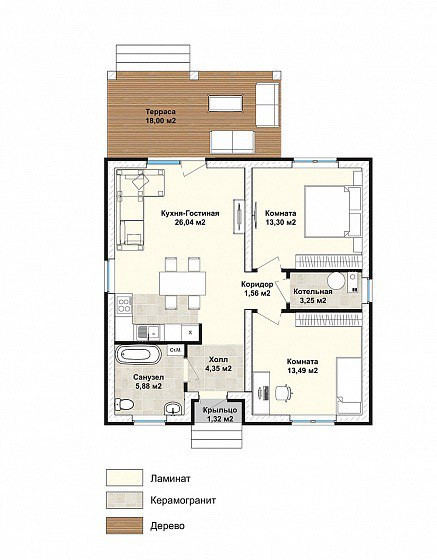 -уютная терраса - 18 м2, -две спальни - по 14 м2, -кухня-гостиная - 26 м2, -санузел- 3,25 м2, -котельная, где возможно разместить дополнительный санузел.