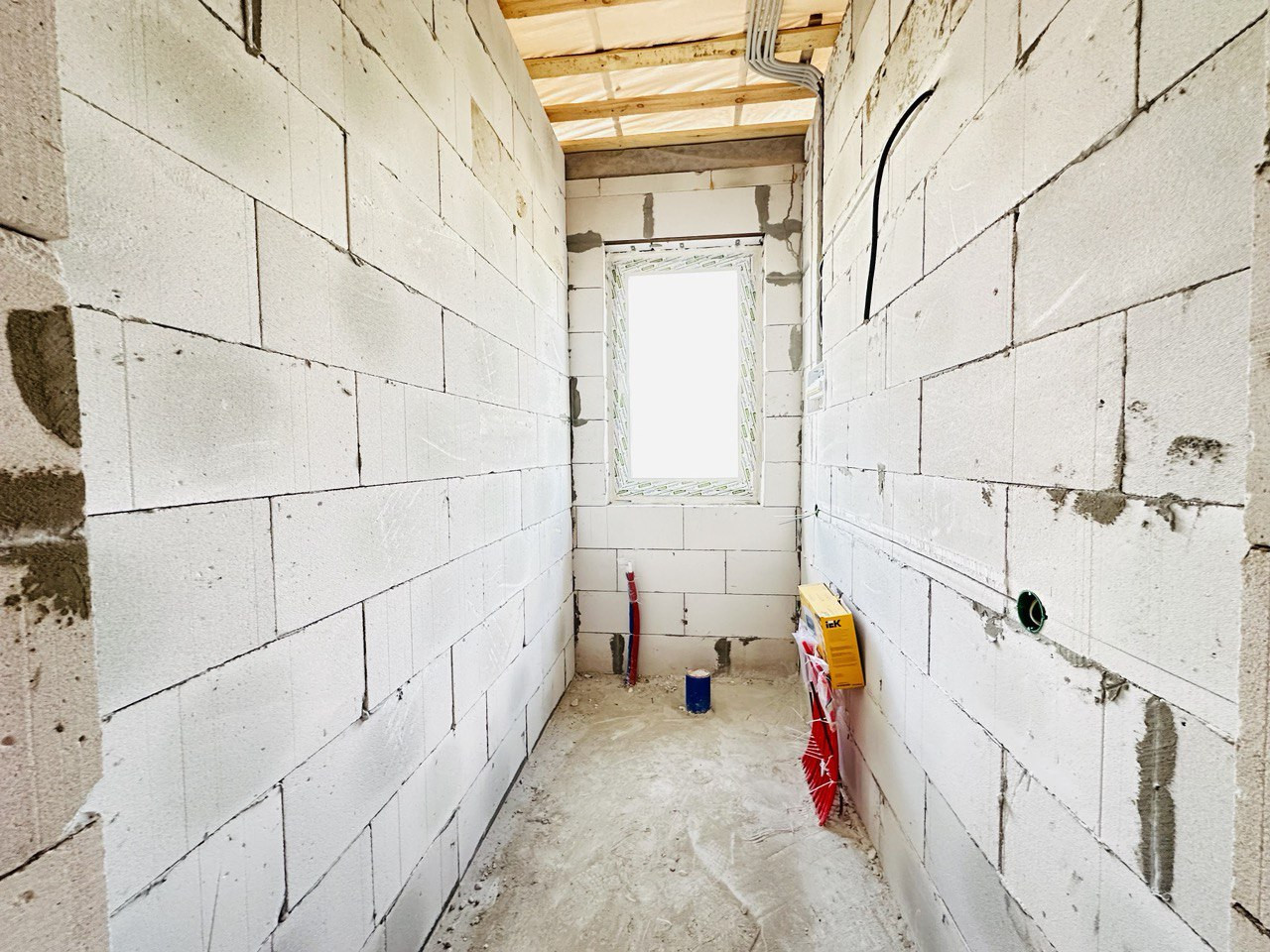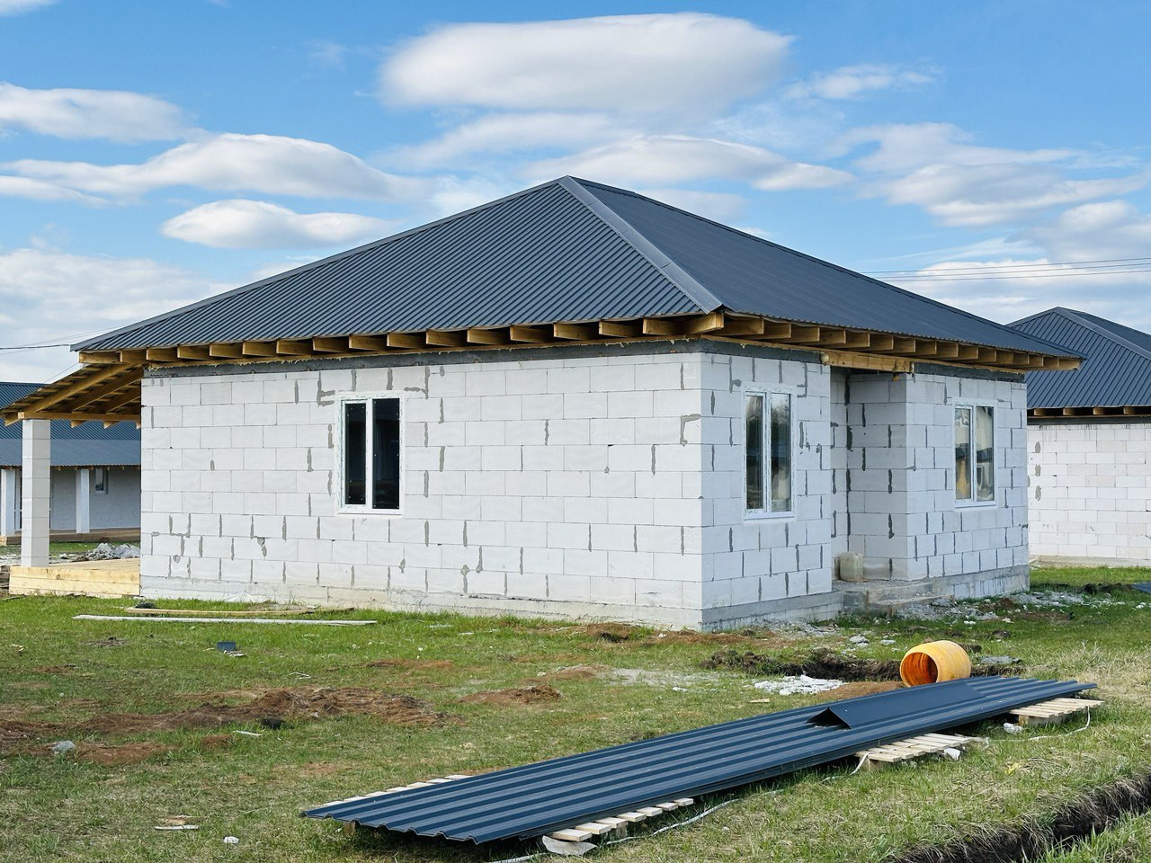 -фундамент - железобетонный свайно-ростверкный с обратной засыпкой и монолитной плитой, -стены - кладка выполнена из газоблока, с утеплением, -кровля - деревянная скатная кровля с утеплением 200мм эковатой. Покрытие металлочерепица «Монтерей» цвет на выбор (серый, коричневый, красный, зеленый), -окна пластиковые, с двойным стеклопакетом (3 стекла), 5 камерный профиль, -двери, входная – металлическая, с терморазрывом; на террасу – пластиковая, со стеклопакетом.