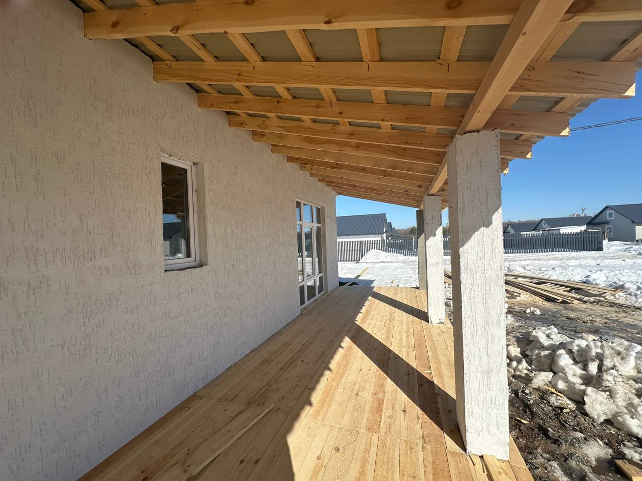 -фундамент - железобетонный свайно-ростверкный с обратной засыпкой и монолитной плитой, -стены - кладка выполнена из газоблока, с утеплением, -кровля - деревянная скатная кровля с утеплением 200мм эковатой. Покрытие металлочерепица «Монтерей» цвет на выбор (серый, коричневый, красный, зеленый), -окна пластиковые, с двойным стеклопакетом (3 стекла), 5 камерный профиль, -двери, входная – металлическая, с терморазрывом; на террасу – пластиковая, со стеклопакетом.