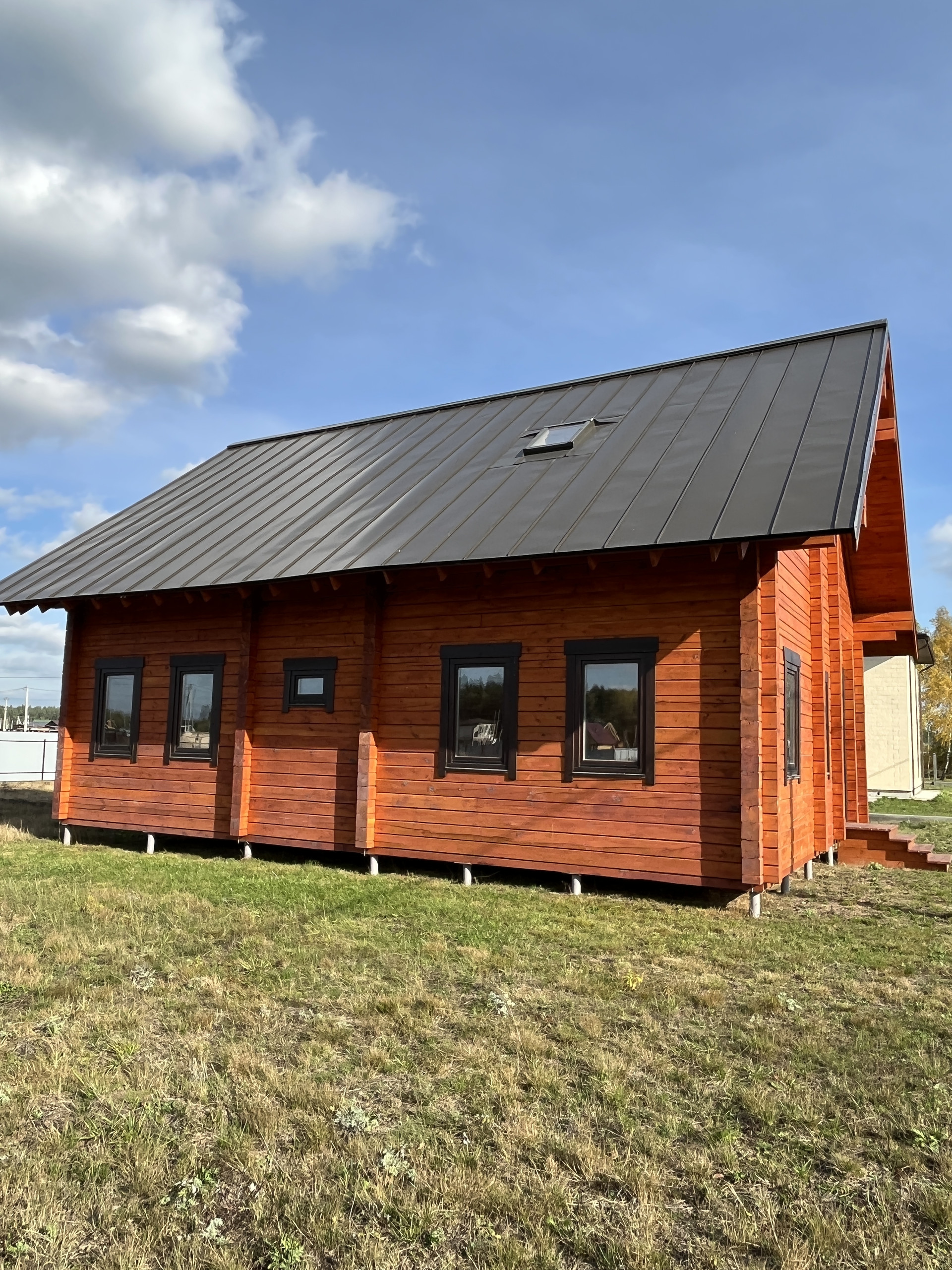 Кровля из металлочерепицы с установкой водосточной системы. Выполняется подшивка фронтонов и потолков вагонкой, вагонка окрашивается Пинотексом.