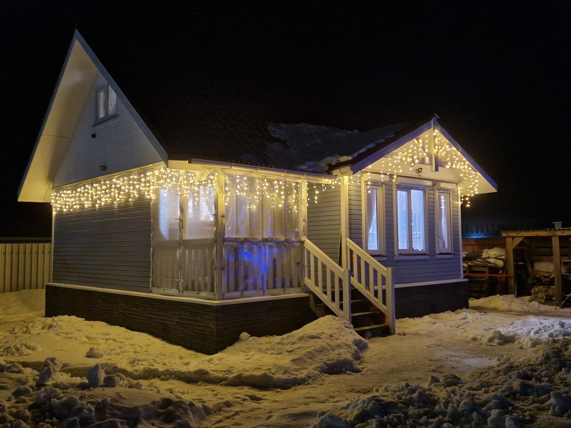 Тепло: крыльцо и вся беседка оборудована мягкими окнами. Снег и дождь осенью и зимой к вам не попадут