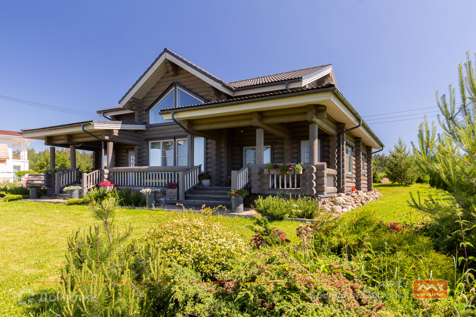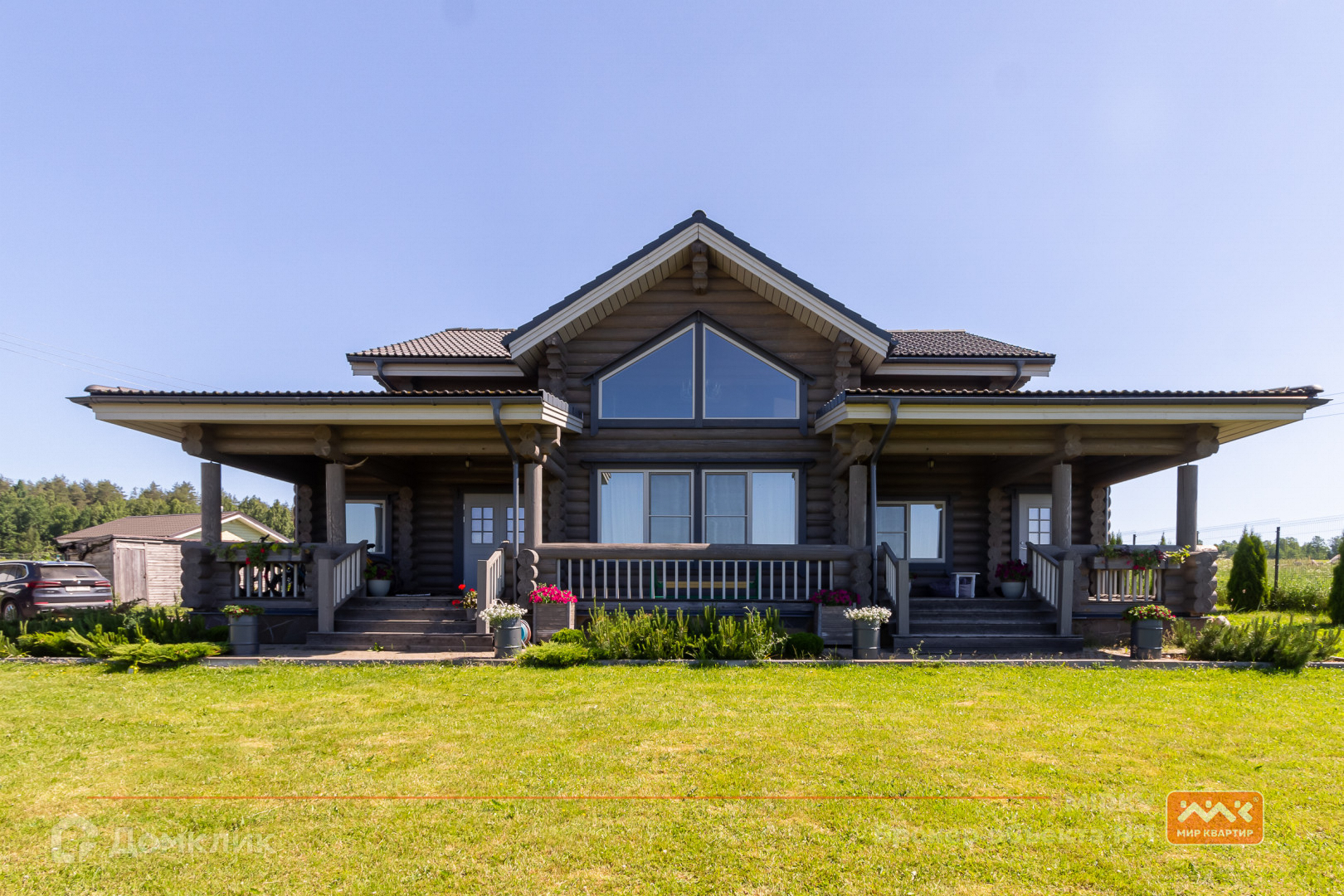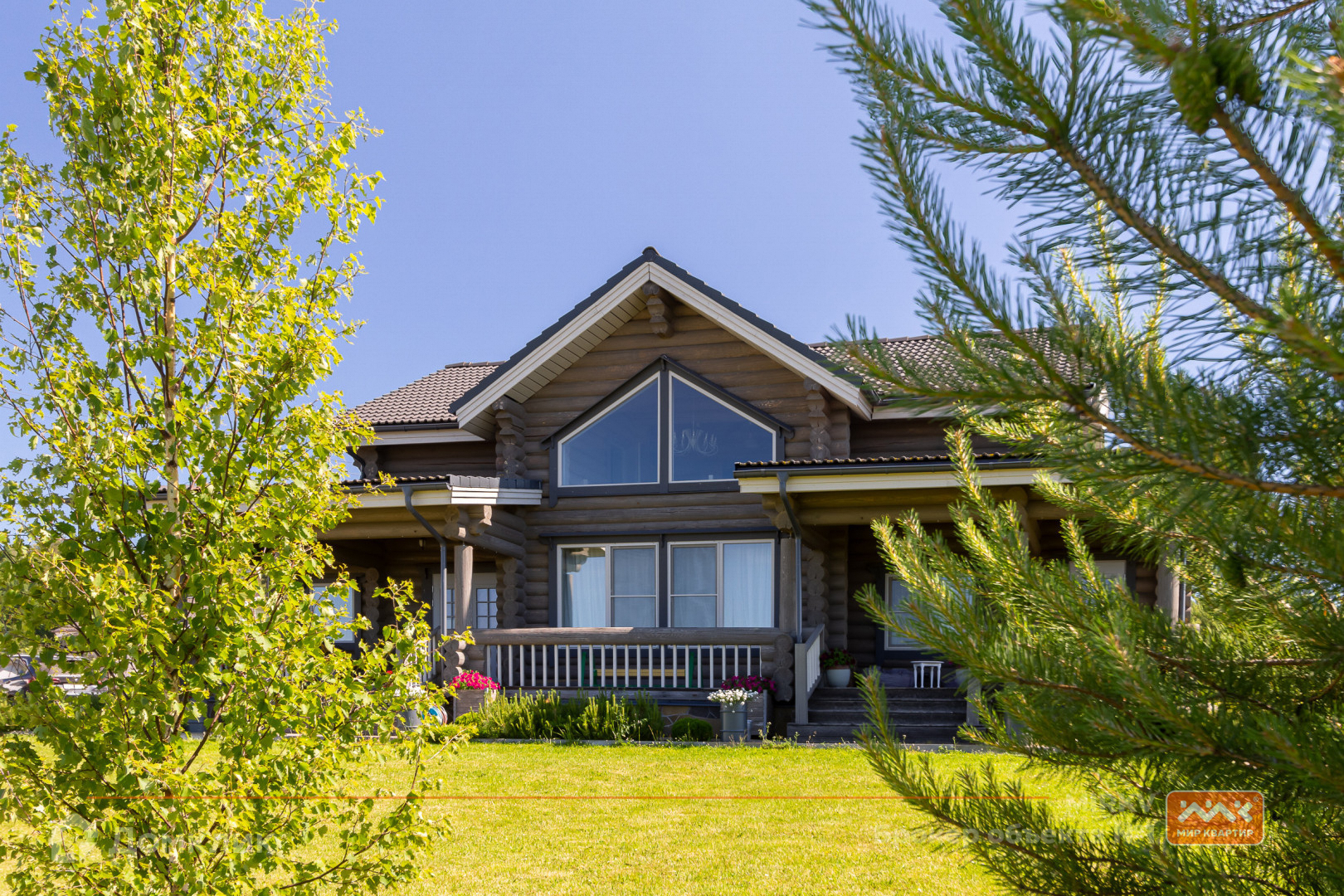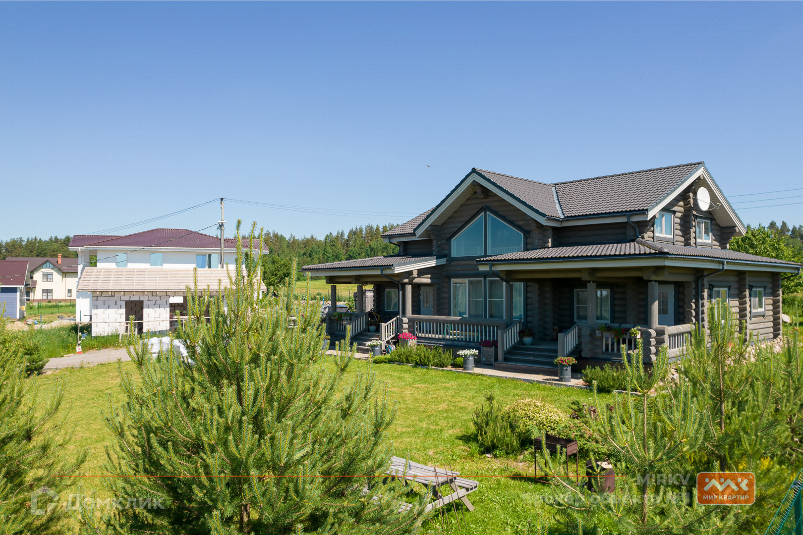 Коттедж в два этажа расположился на участке в 30 соток с газоном, яблонями и елями, построен из бревна, фундамент – железобетонная плита, крыша - натуральная черепица Braas. Участок сухой, так как расположен на самой верхней части посёлка. Так же расположение дома даёт ощущение уединения, так как в окнах вы увидите бескрайнее небо, поля и леса, что делает это предложение уникальным!
