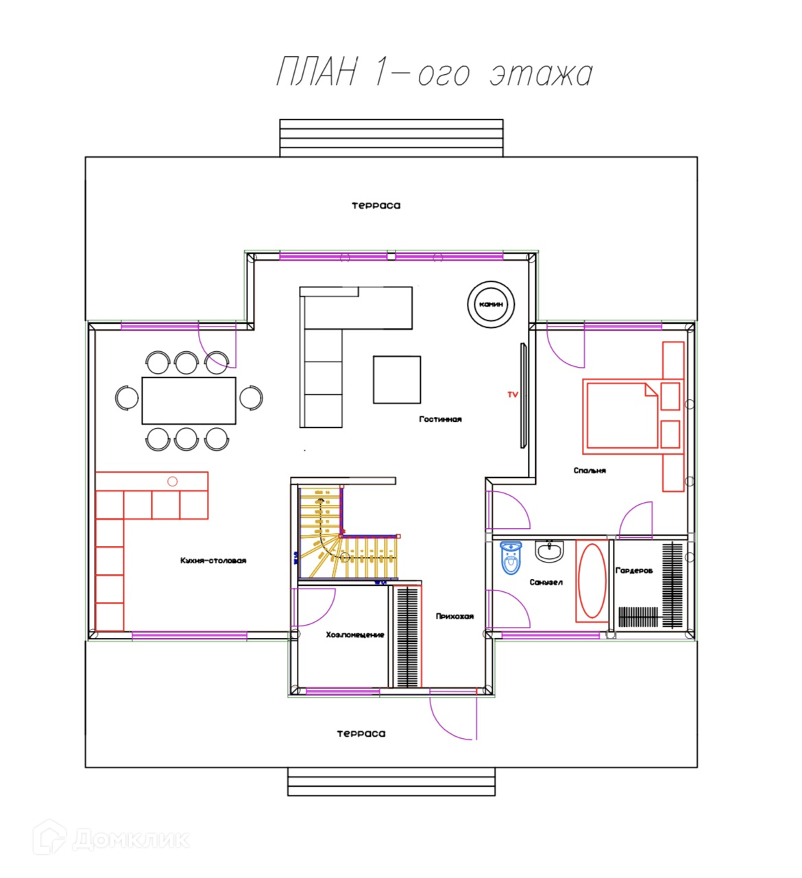 Первый этаж включает в себя холл с гардеробом, просторную зону кухня-столовая-гостиная со вторым светом и выходом на террасу обращенную в сторону елового леса, гостевой санузел и гостевую спальную комнату со своим выходом на террасу.
