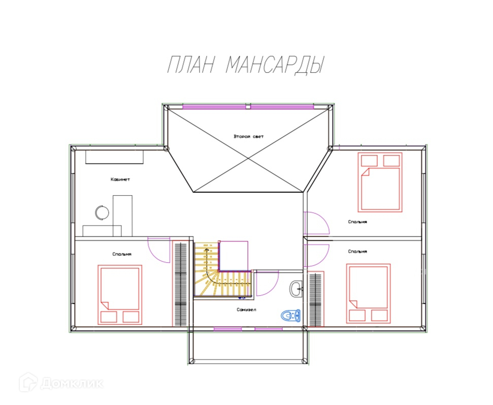 На втором этаже расположено три изолированные спальные комнаты, общий санузел и свободное пространство отведенное под кабинет.