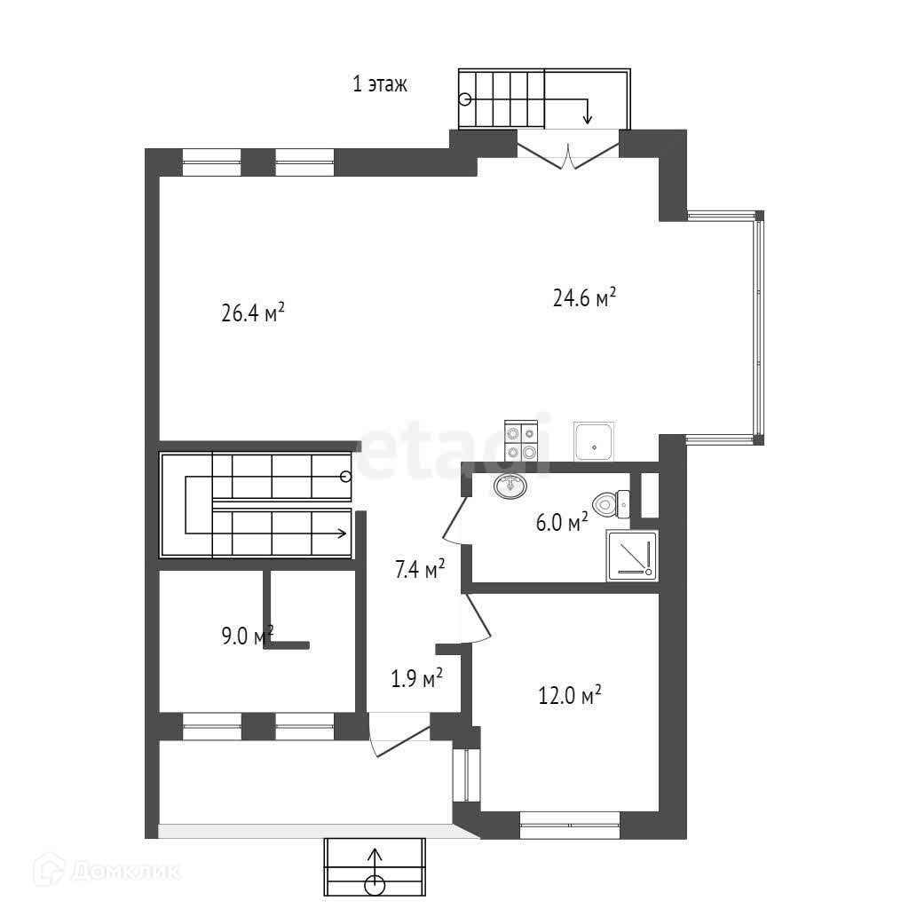 На первом этаже расположена кухня-гостиная с выходом во внутренний двор, кабинет, санузел, гардеробная и котельная.