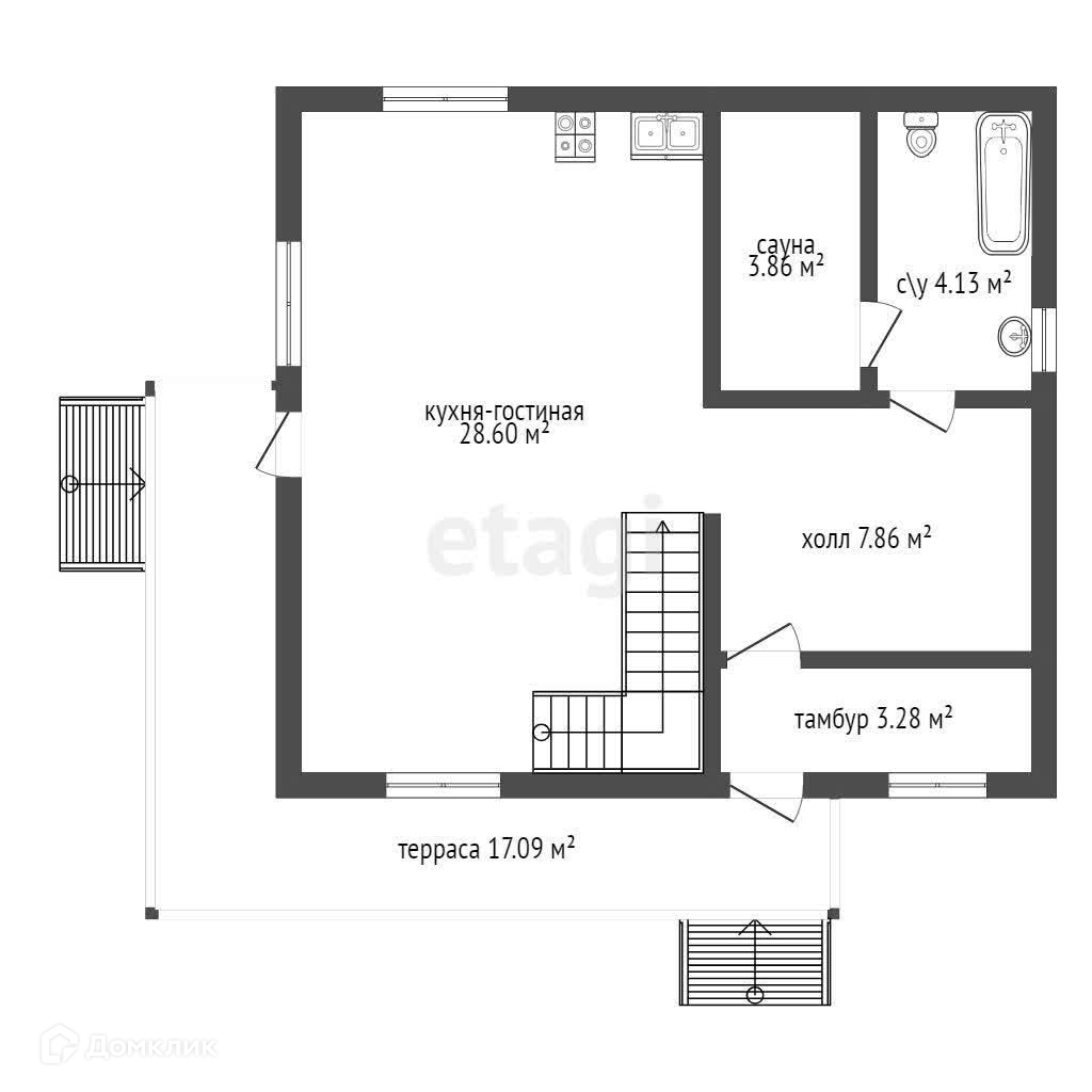 На первом этаже находится просторная кухня-гостиная, просторная прихожая, гостевой санузел и гардероб.