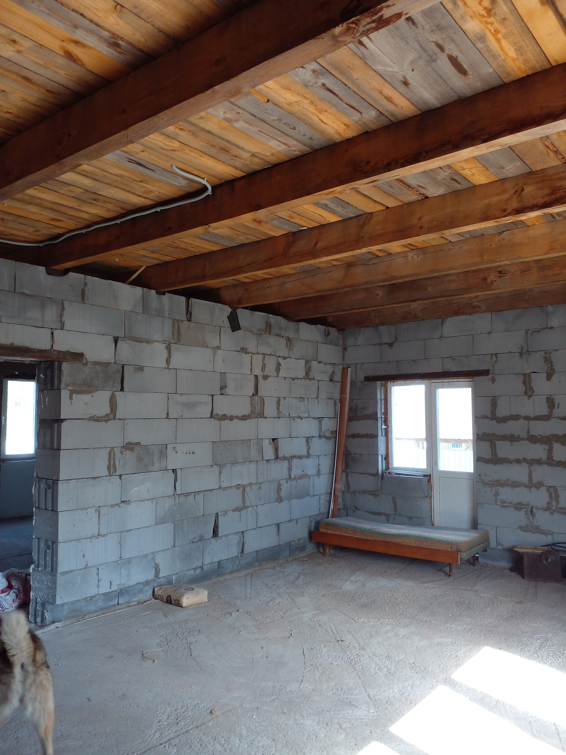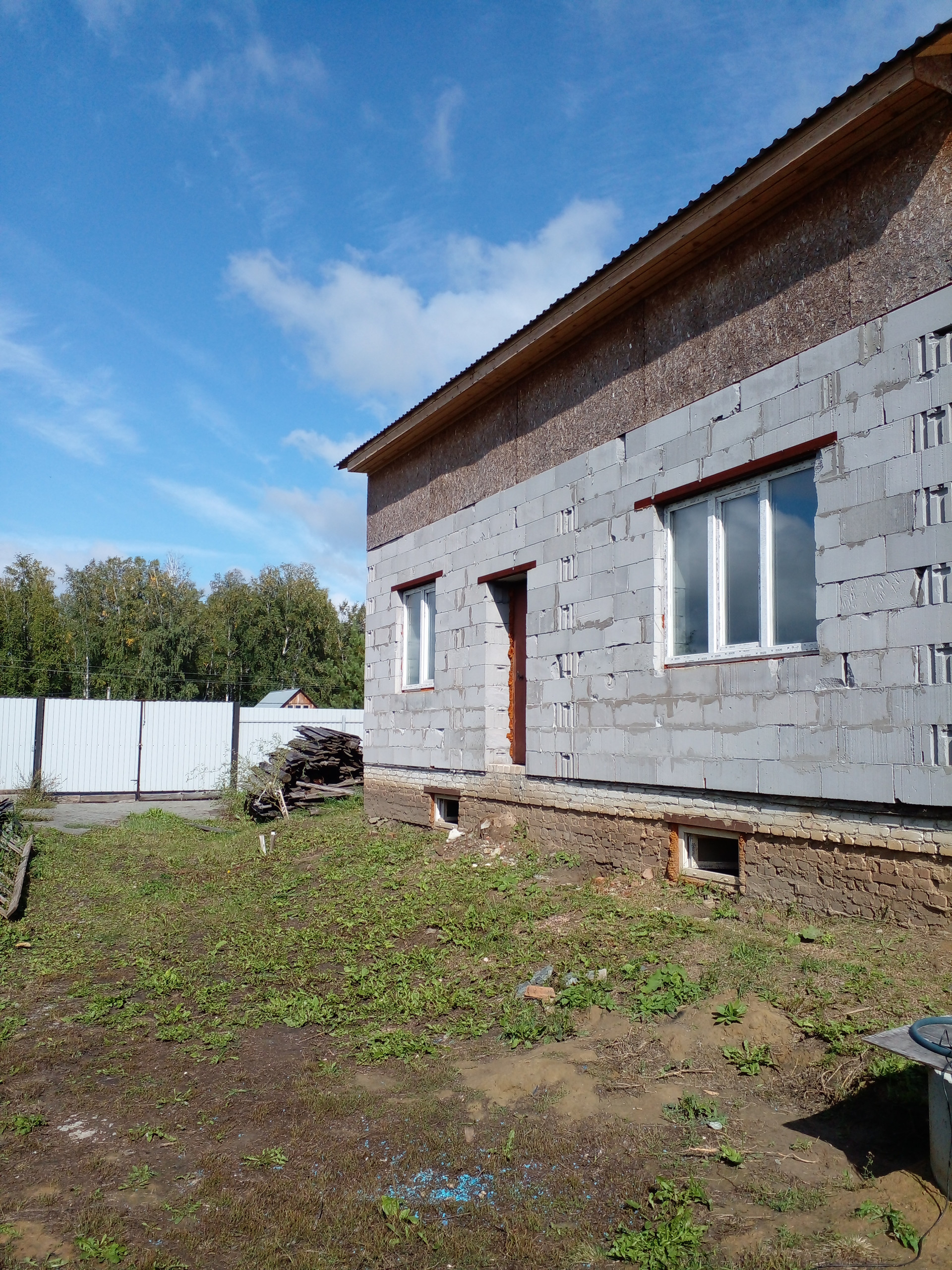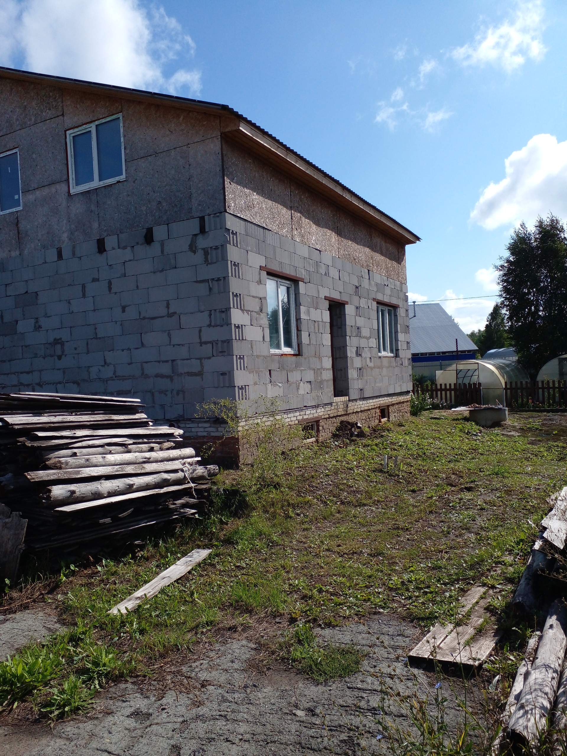Недостроенный дом( фундамент-ж/б блоки, стены-пораблок, крыша -профлист), 10х11 м, подвал под всем домом и два этажа, внутренние перегородки на обоих этажах, установлены окна.  Газ рядом с участком, скважина (50 м) с кессоном, колодец с питьевой водой. Есть небольшой жилой домик (в перспективе - баня). В домик заведена вода из скважины, ванна, водонагреватель, отопление электрическое. Участок огорожен по всему периметру забором из профлиста. На участке находятся две теплицы из поликарбоната, все насаждения( яблони, вишня. смородина, крыжовник, жимолость. виноград. виктория. малина). Участок удобно расположен: съезд с асфальта, остановка автобуса напротив ворот. В селе есть школа,  детский сад, почта, фельдшерско-акушерский пункт, несколько продовольственных и непродовольственных магазинов.