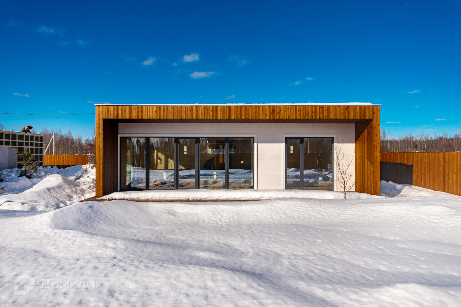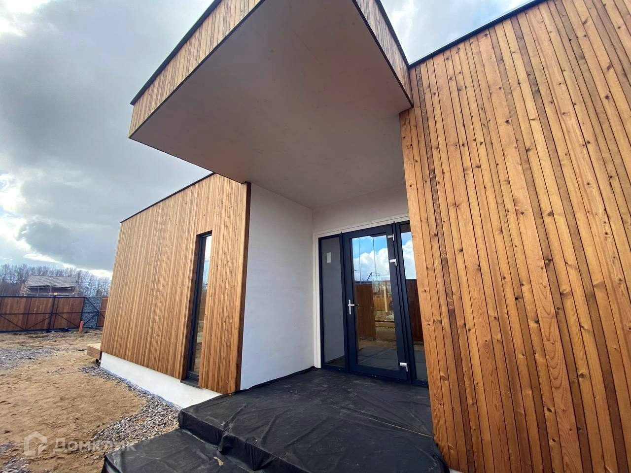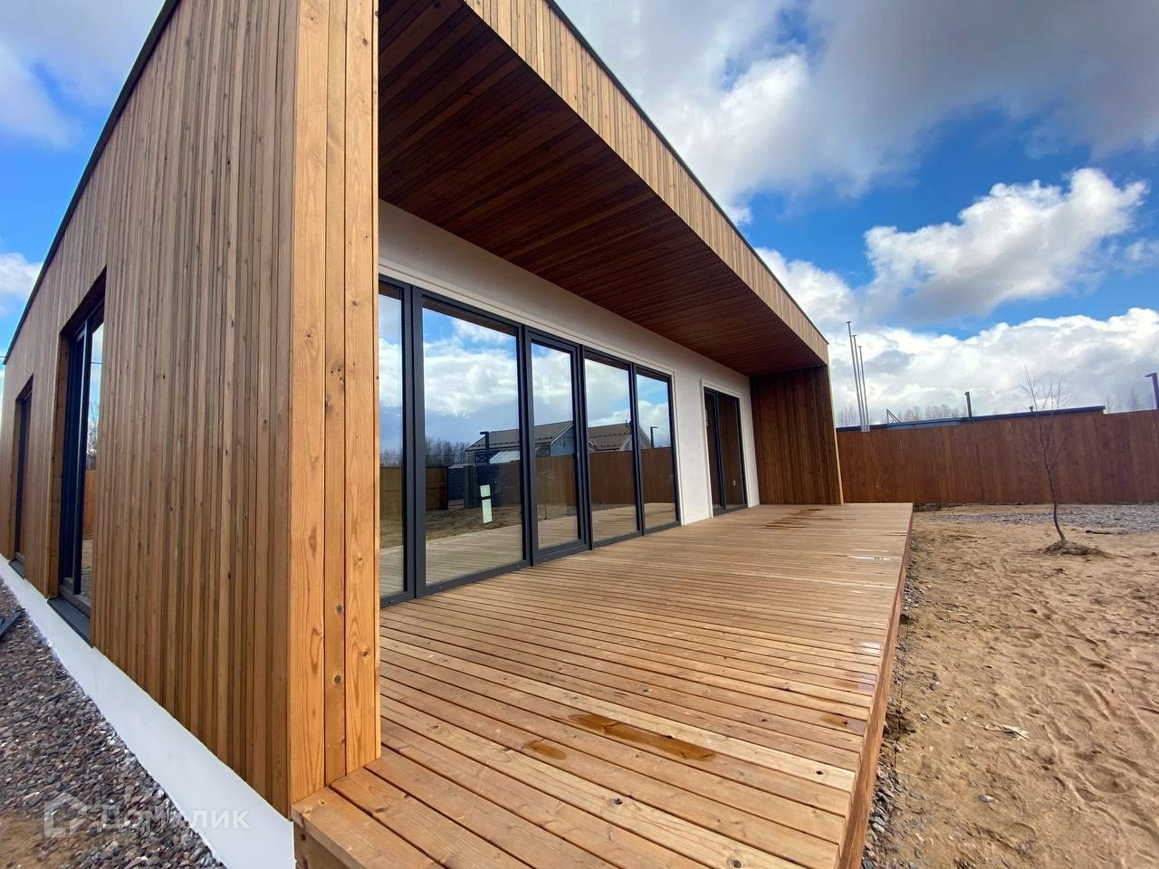 Облицовка фасада выполнена брусками из термосоcны, покрытые натуральным маслом, остекление всего дома панорамными двухкамерными  энергоэффективными стеклопакетами с солнцезащитным напылением.