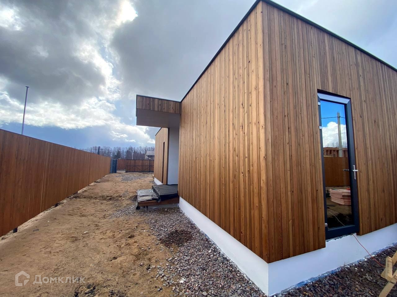 Участок отсыпан песком и разработан для будущего засева или раскатки газона, сделан дренаж, установлен забор (бруски термососны и габионы ), въездная группа оформлена автоматическими откатными воротами.
