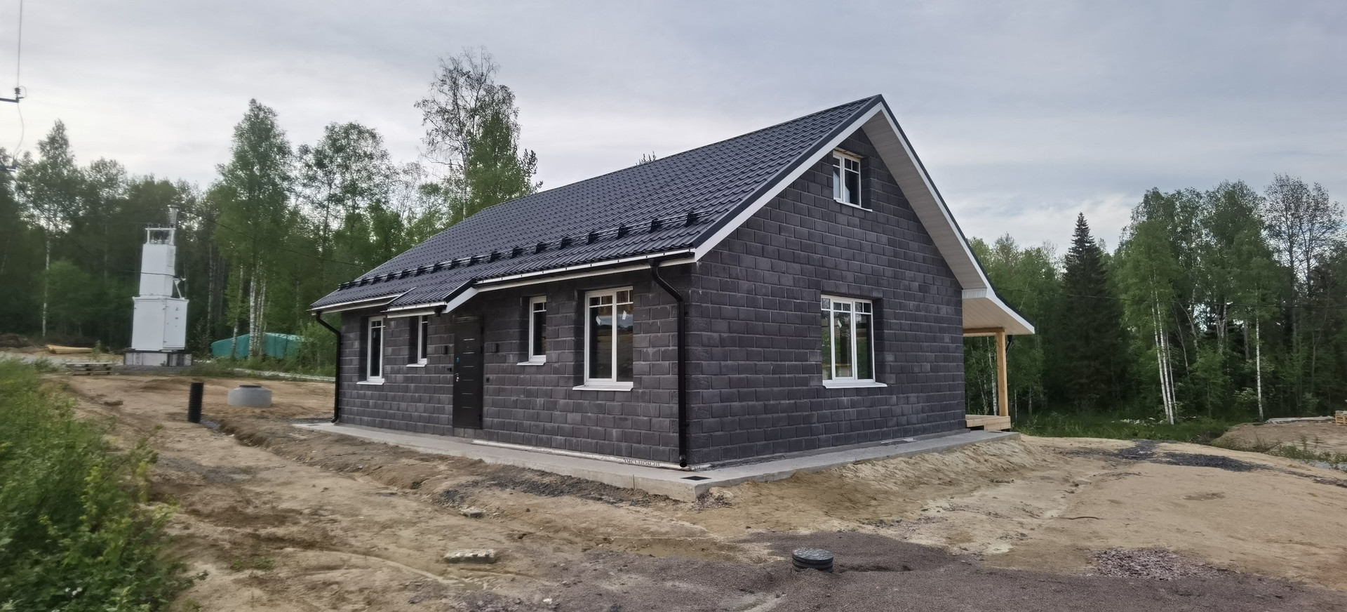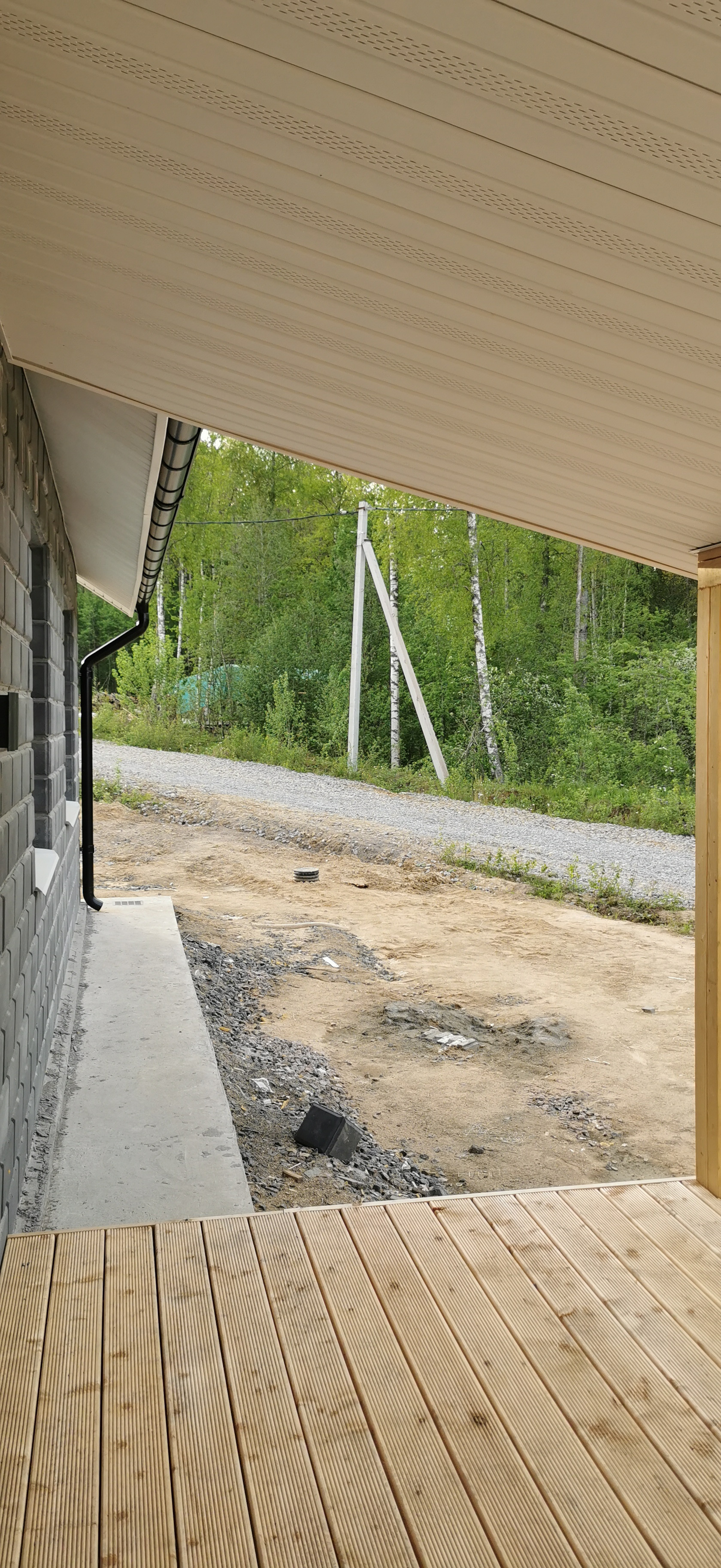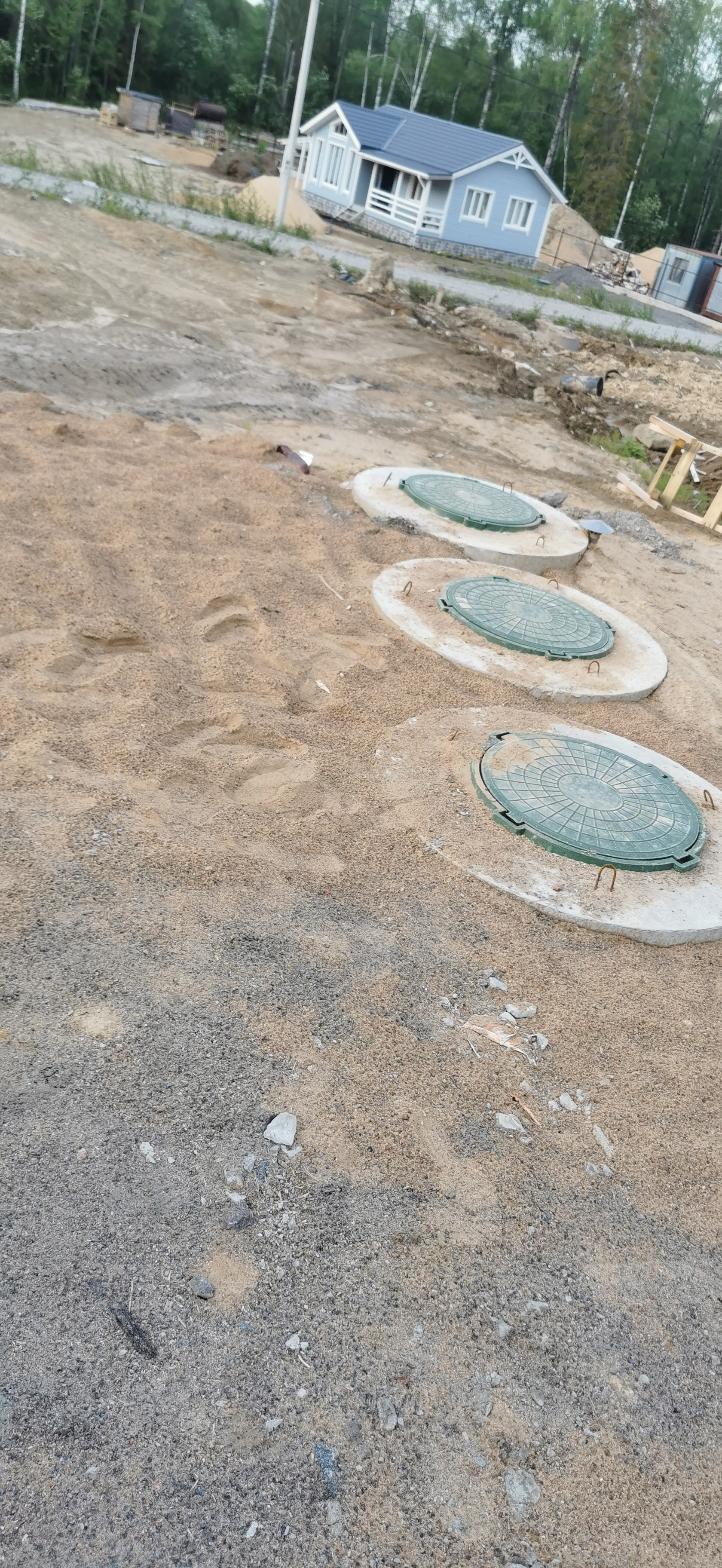 Дренажная система вокруг участка (поэтому участок сухой, есть небольшой уклон, с террасы прекрасный вид на лес