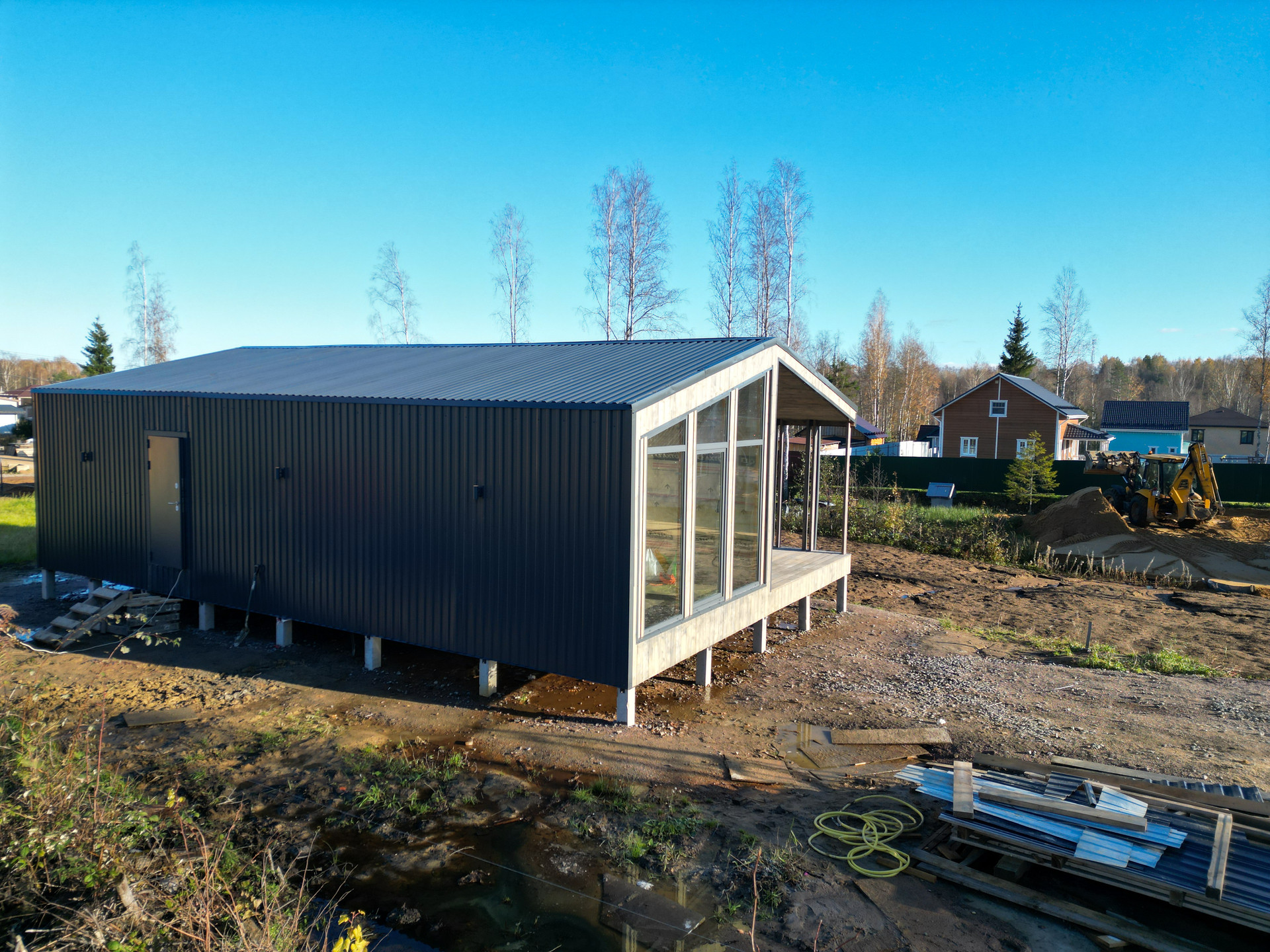 Снаружи крыша покрыта качественным профнастилом. Облицовка стен дома выполнена частично профнастилом с подветренной стороны, что продлевает срок эксплуатации дома и частично блок хаусом (имитация бруса).