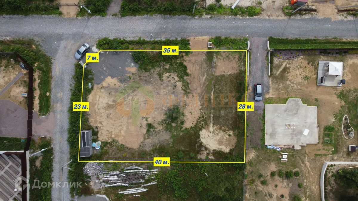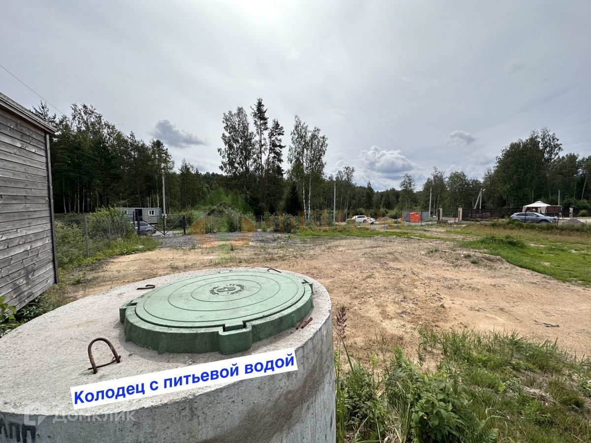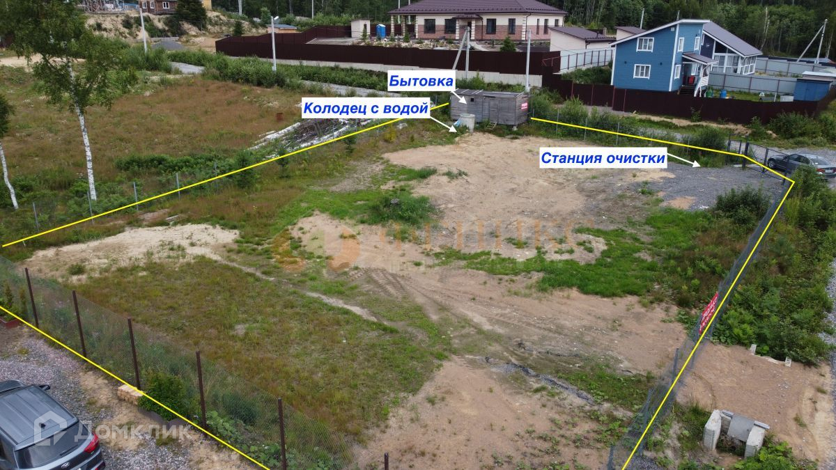 Участок высокий, сухой, угловой, обнесен забором, соседи только с двух сторон. Уже сделан дренаж, расчищена площадка для постройки дома, стоит бытовка.