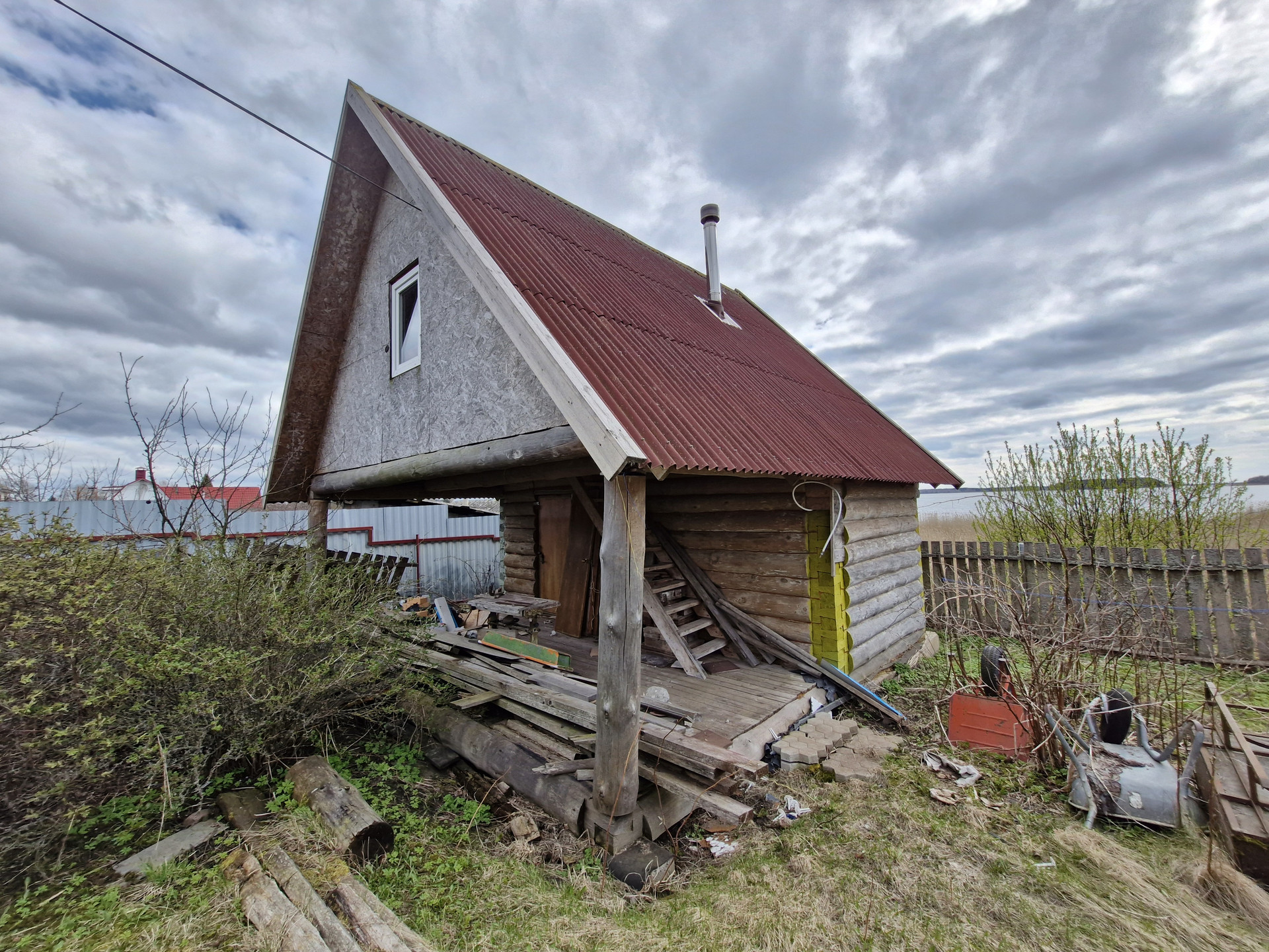Дом  1949 года постройки (одна большая комната с печкой-камином; одна - летняя комната; две кладовки; чердак можно оборудовать под мансарду; газ  баллон; водогрей;), баня  2 года, подведена под крышу и можно пользоваться, парилка - супер, вид из окна бани на озеро. Две лодки  1 на ходу, другую немного подлатать. В доме вода, скважина и насос (вода питьевая), рядом колодец с чистой питьевой водой.