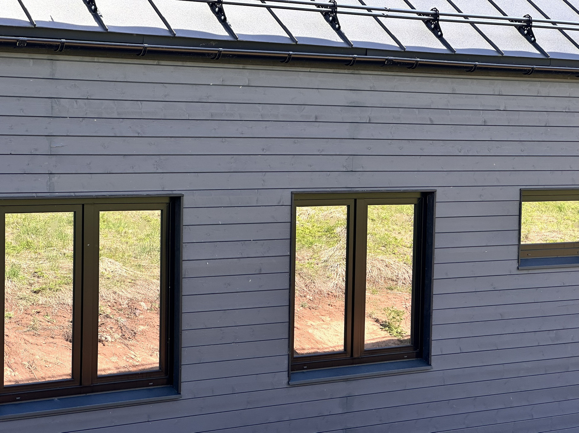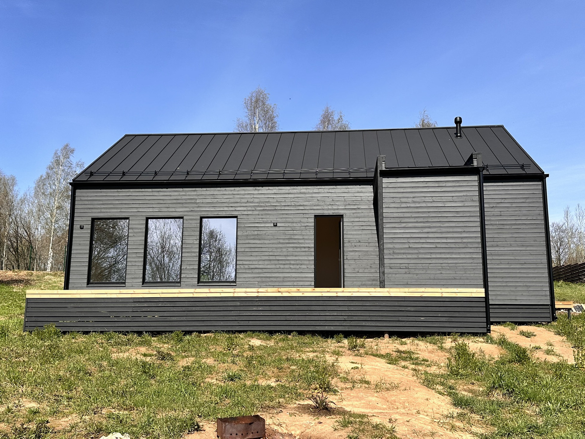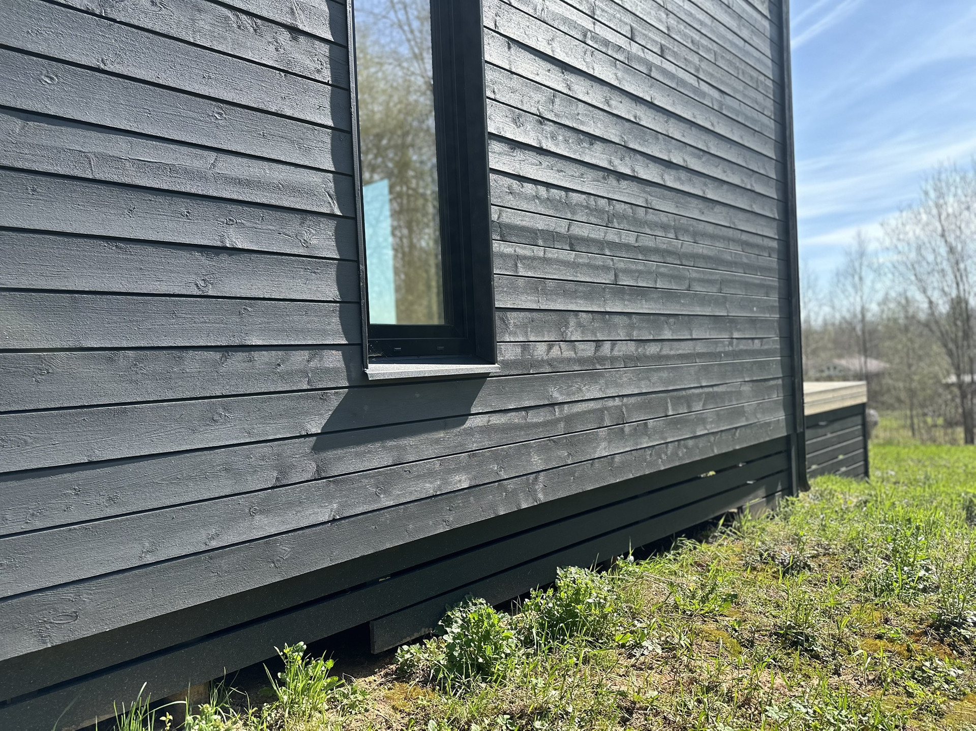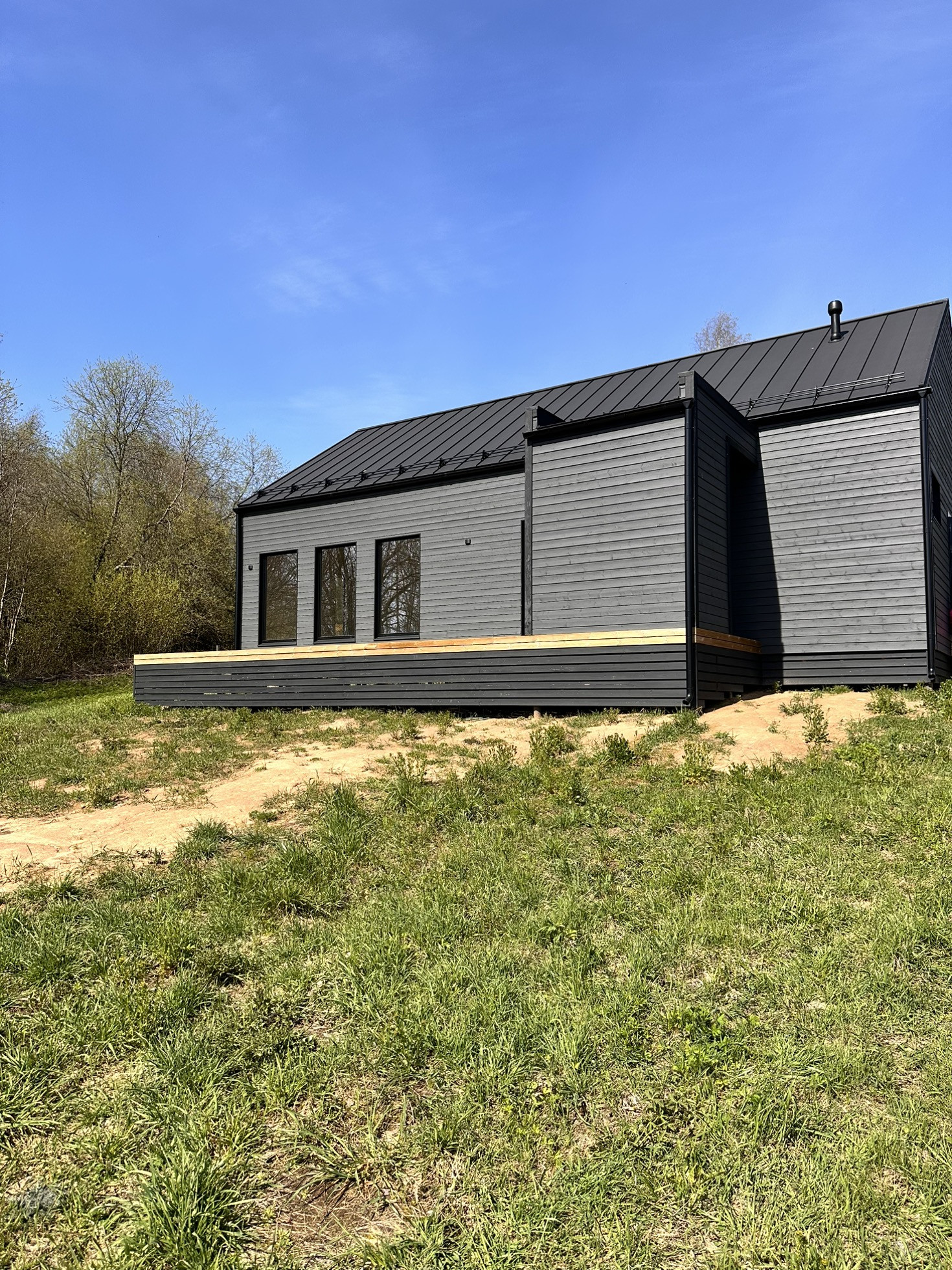 Дом каркасный с Теплой конструкцией как для летнего, так и зимнего проживания. Окна панорамные энергоэффективные, двусторонние (внутри белые, снаружи в тон стен дома). Дорогая крыша со снегозадержателями. Сливная конструкция надежная.