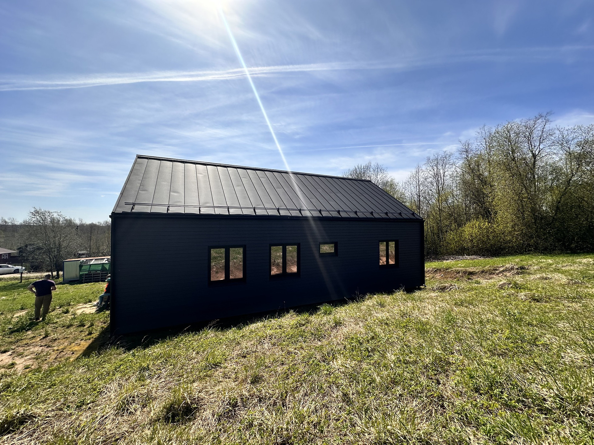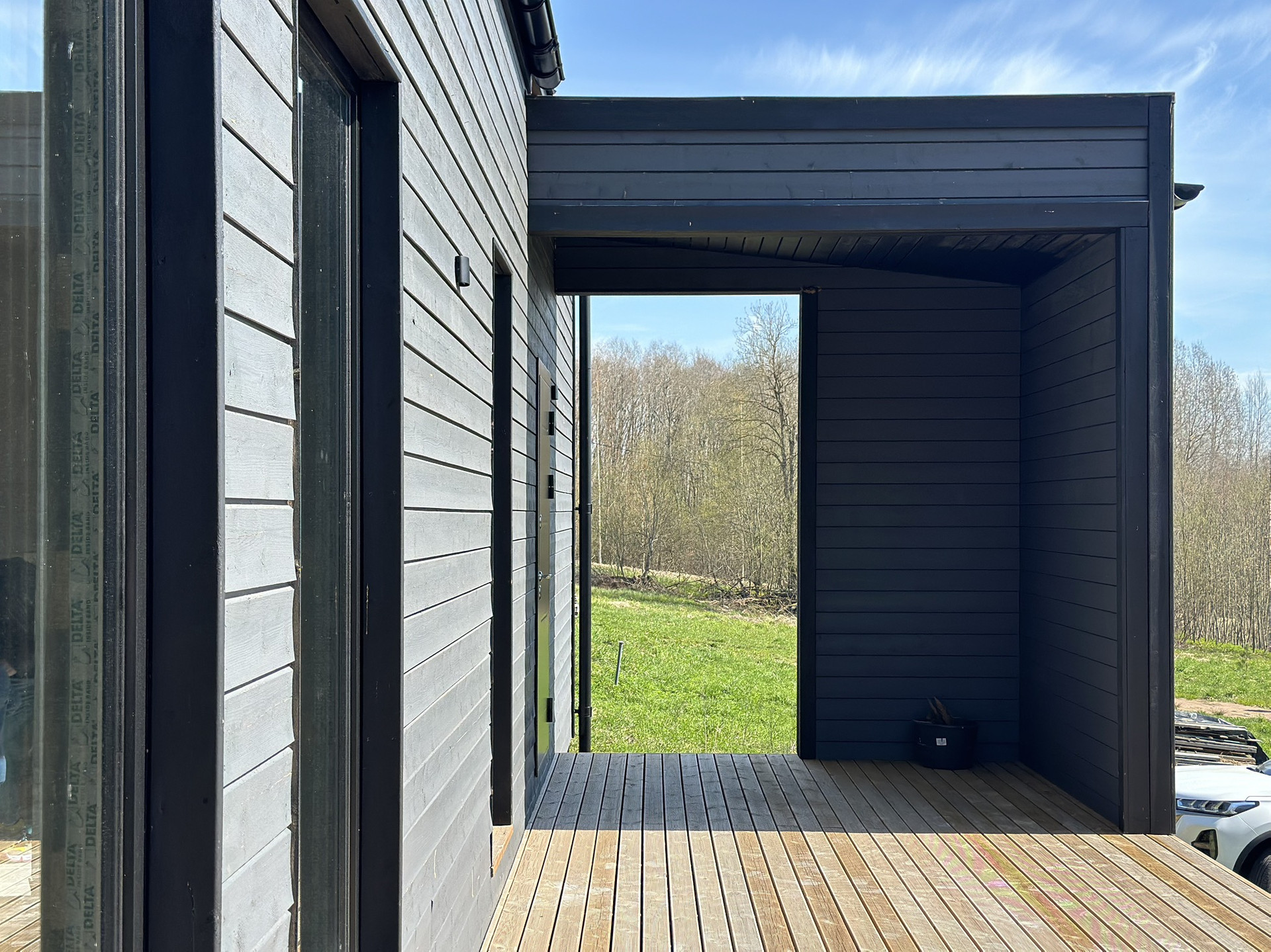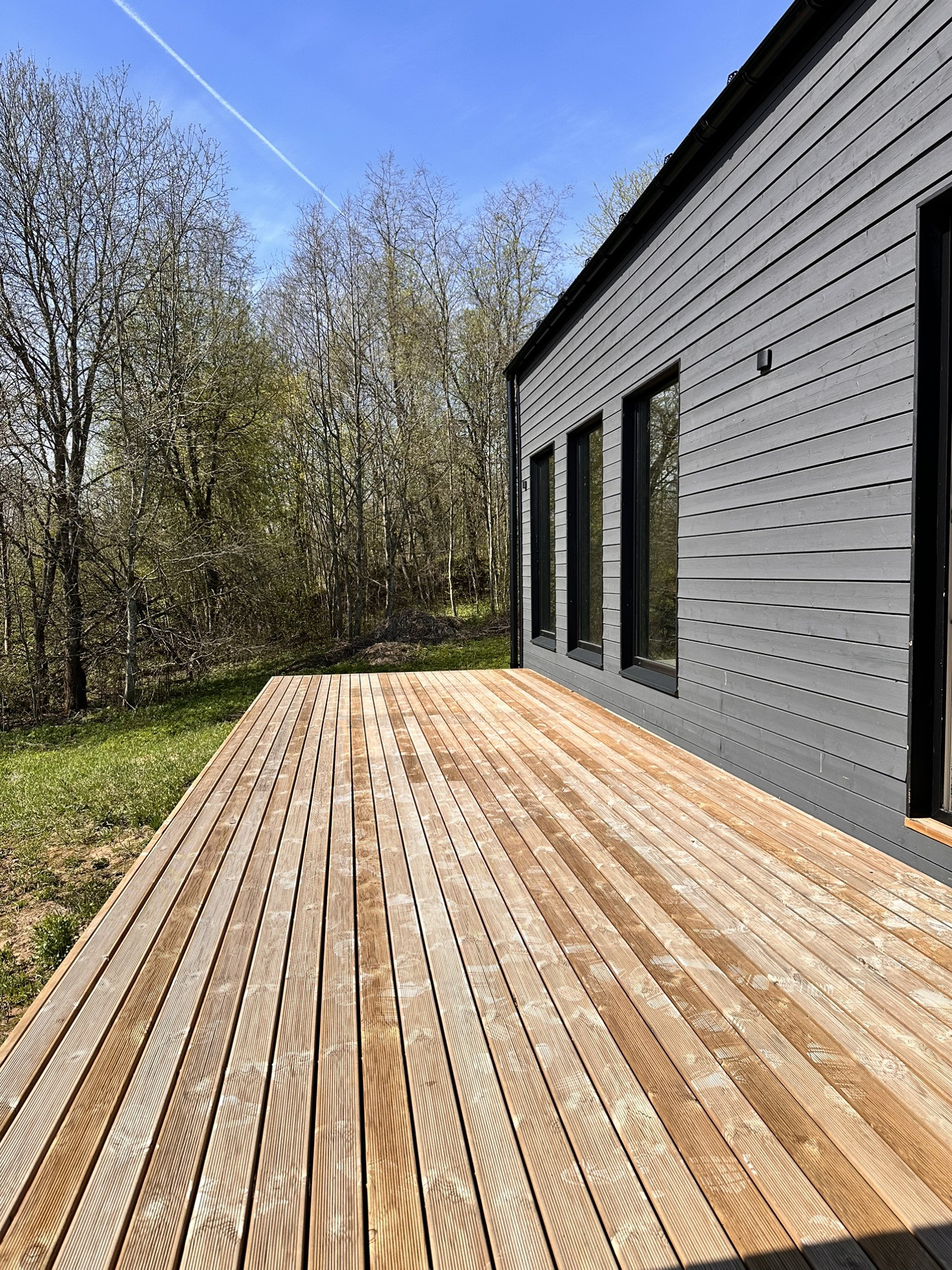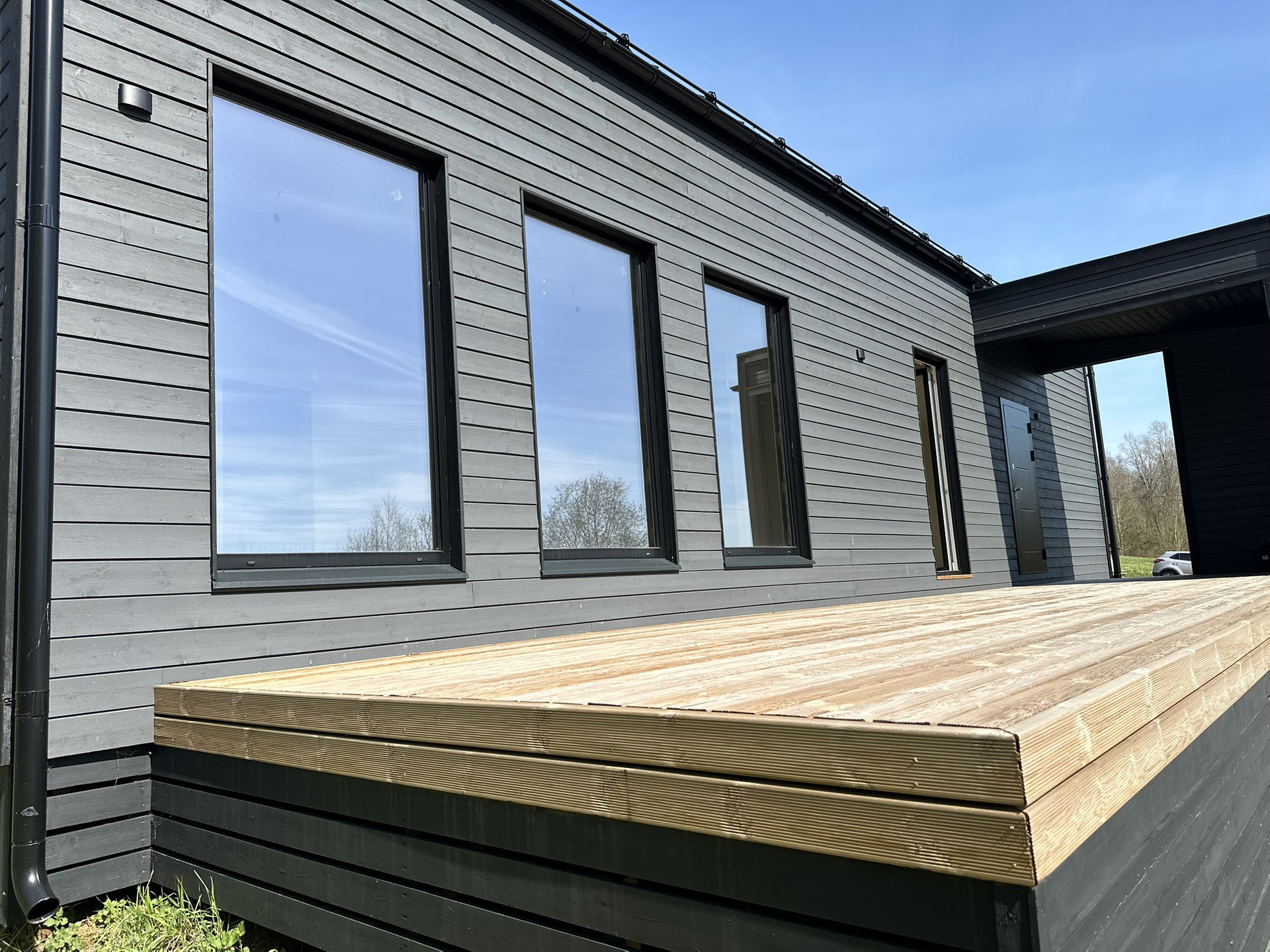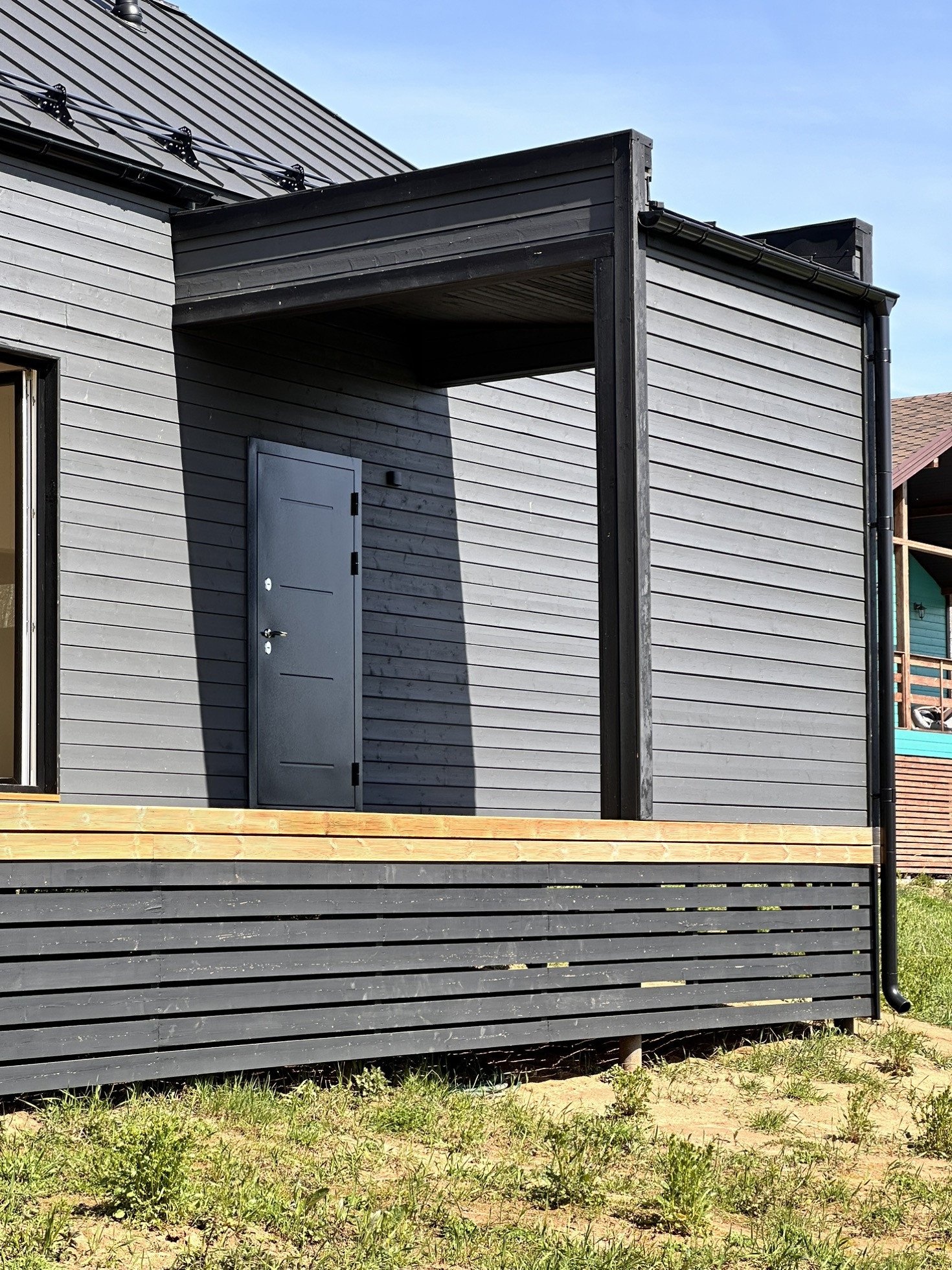 Дом каркасный с Теплой конструкцией как для летнего, так и зимнего проживания. Окна панорамные энергоэффективные, двусторонние (внутри белые, снаружи в тон стен дома). Дорогая крыша со снегозадержателями. Сливная конструкция надежная.