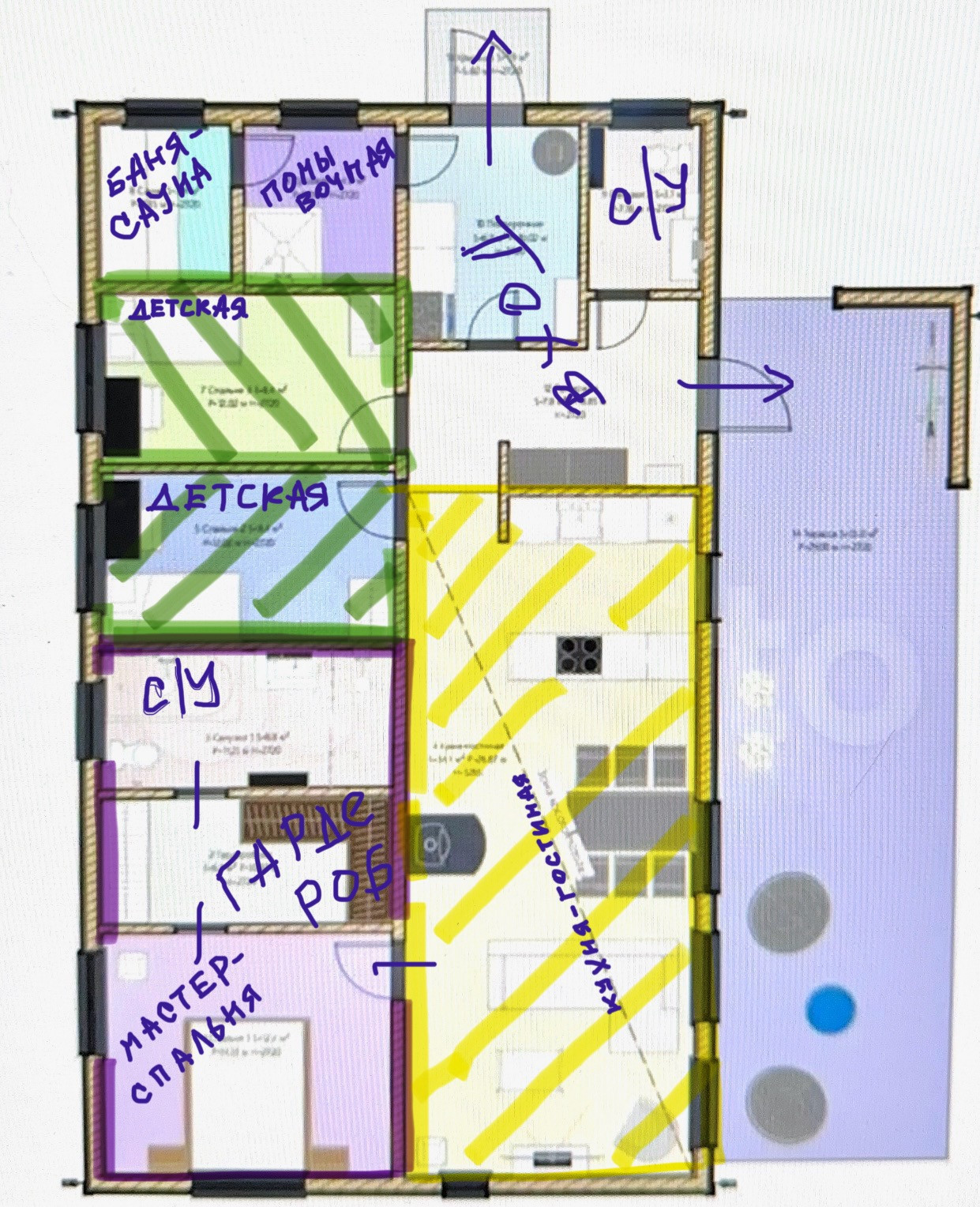 Три спальни, 2 сан/узла, отд/гардеробная комната, Сауна/Баня,  2 Входа, большая современная Терраса. (См. План)