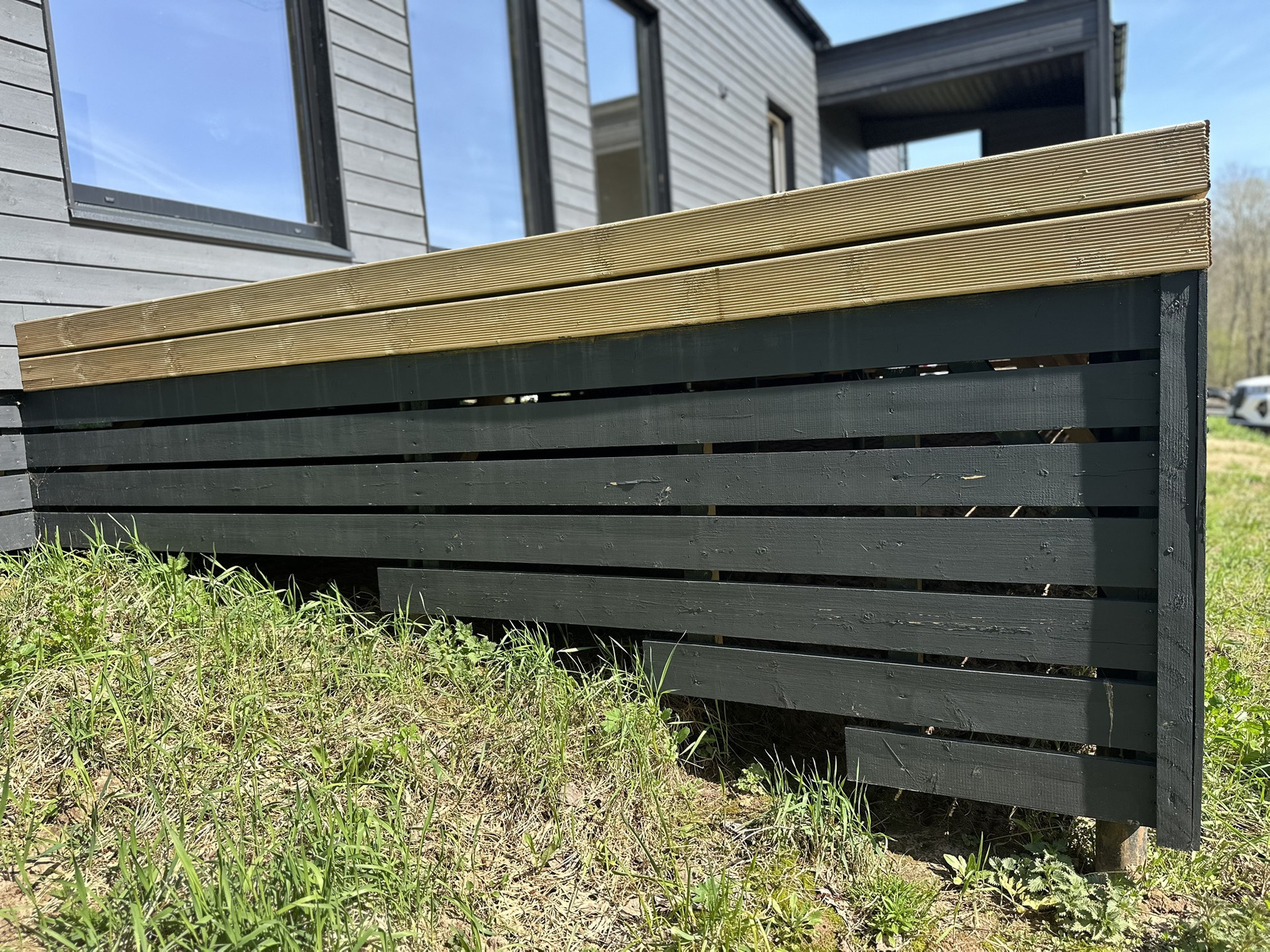 Фундамент свайный облагорожен. На террасе уложена специальная доска, которая не требует замены.