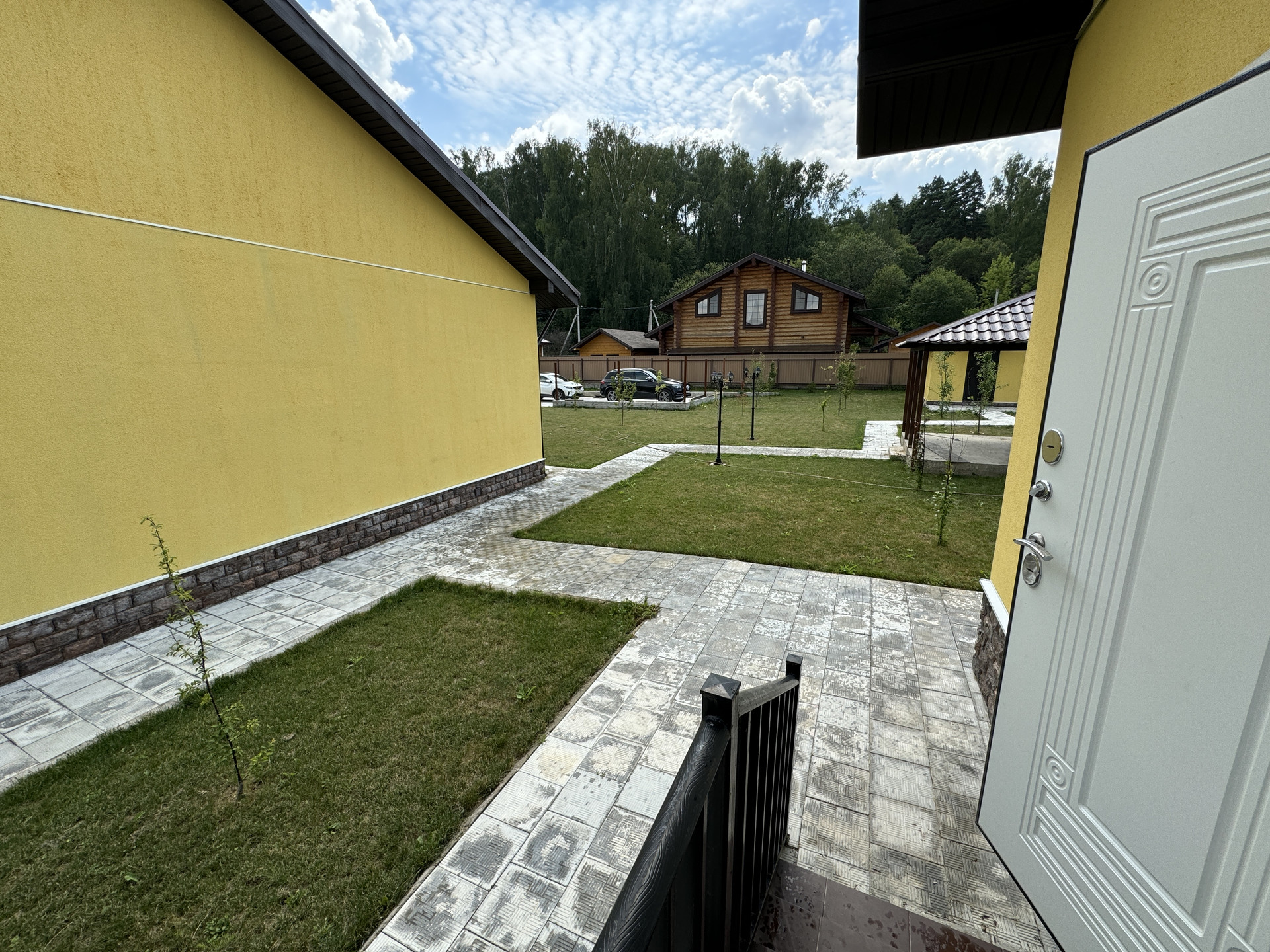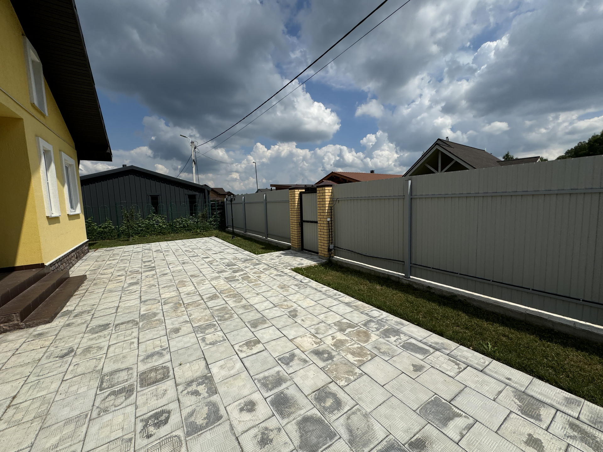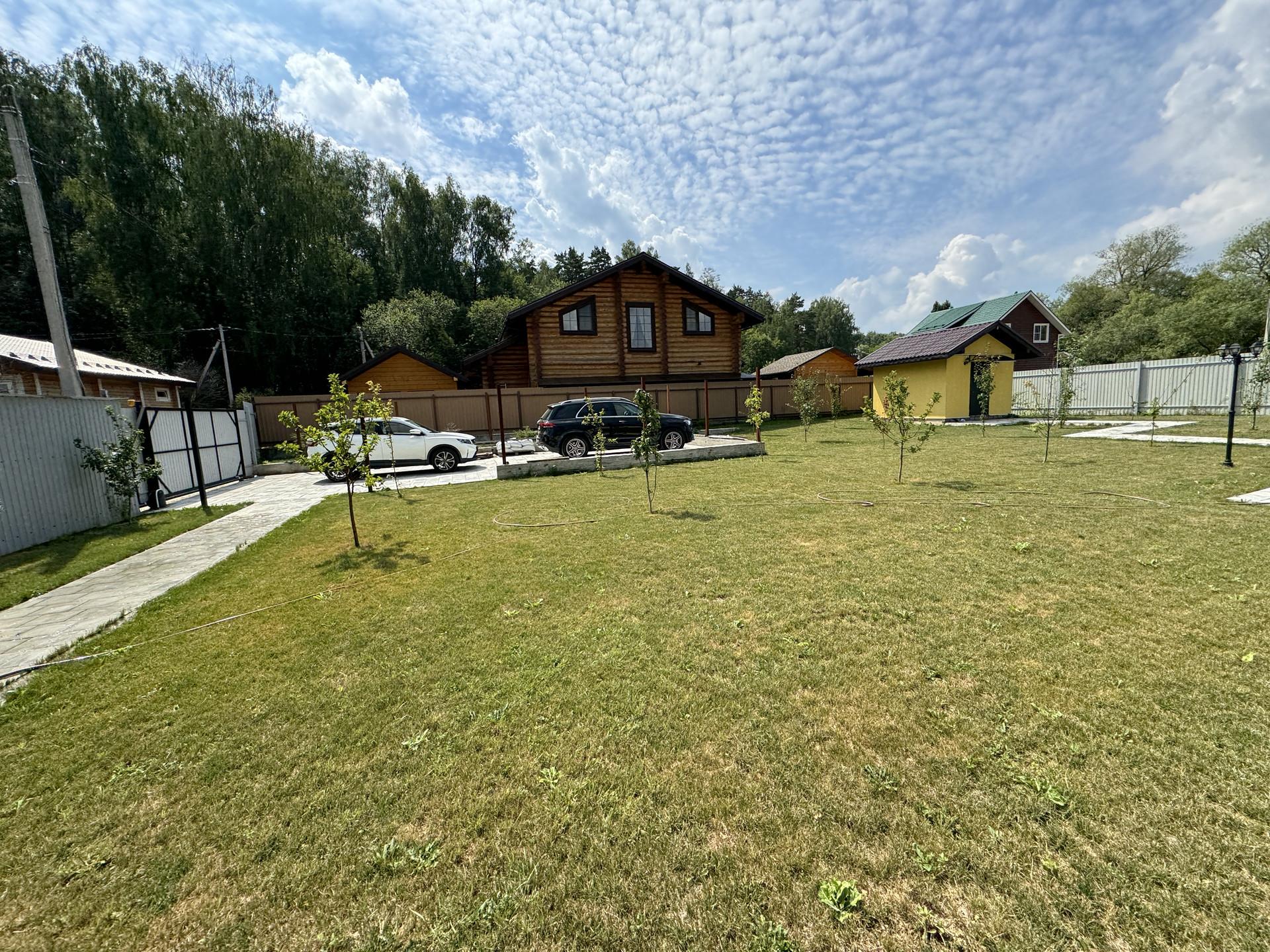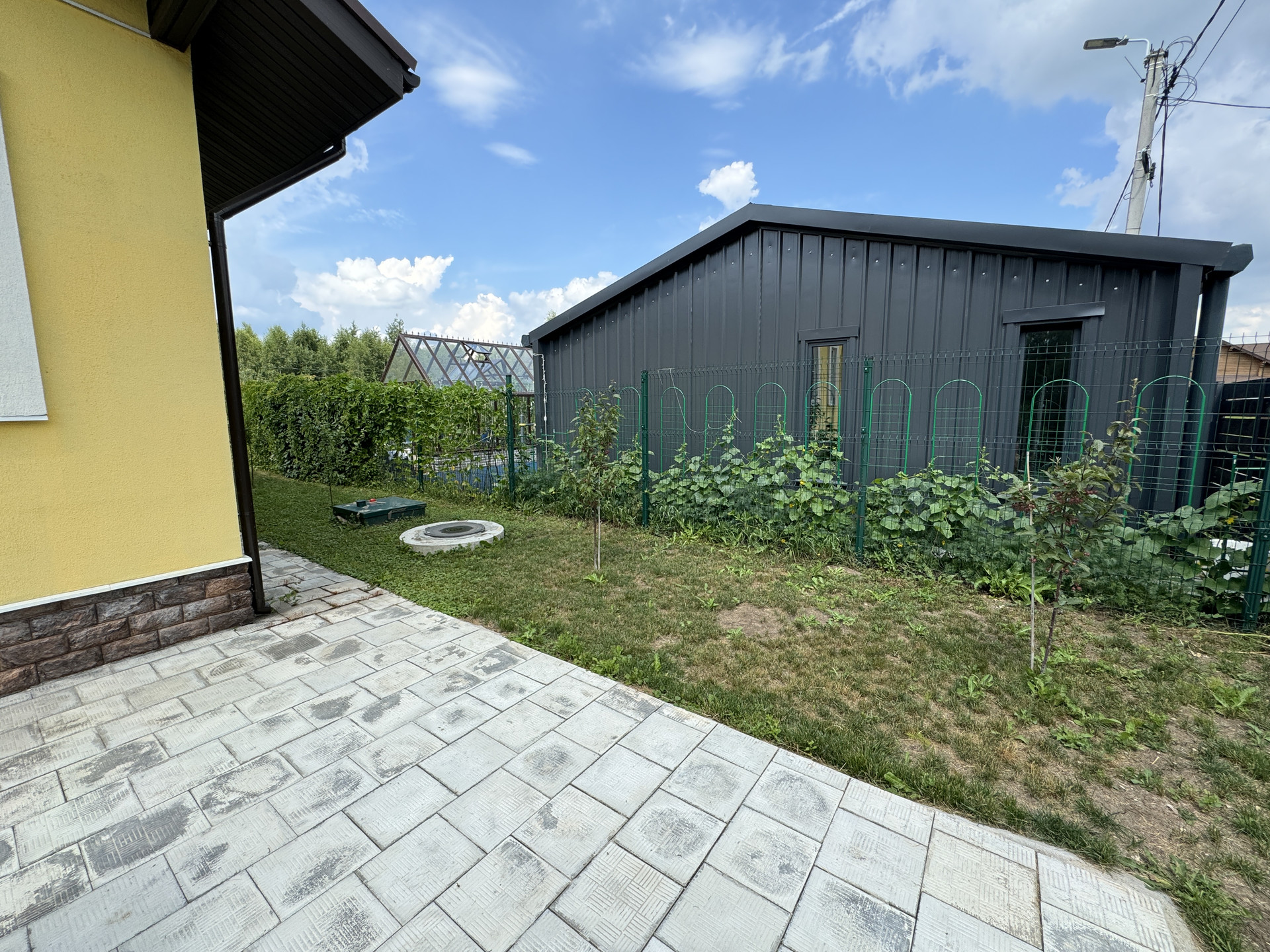 Просторная парковка на несколько автомобилей. Отдельно стоящая бытовка-склад