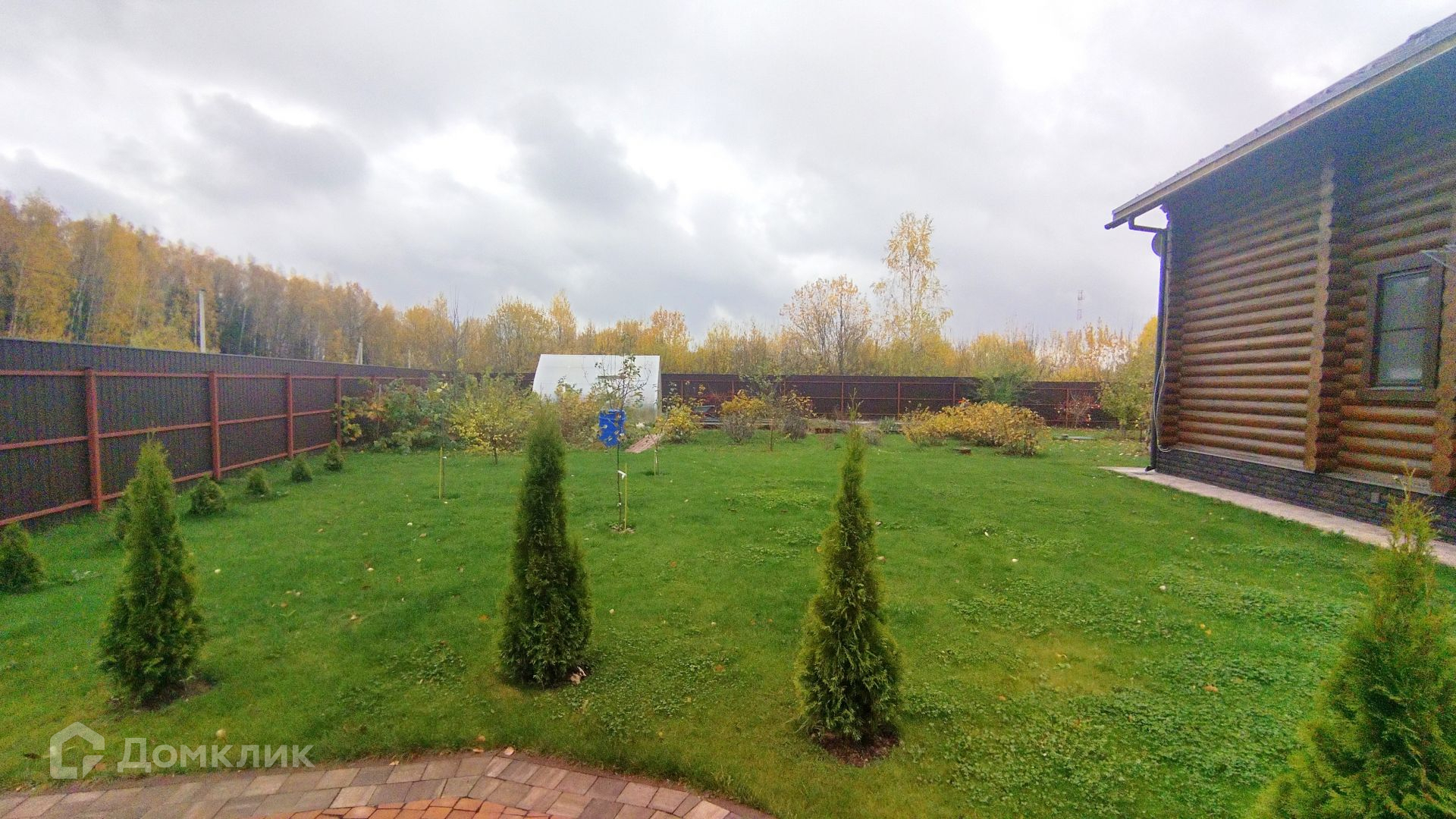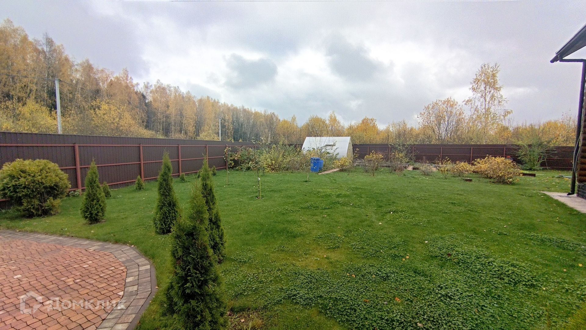 На участке ландшафтный дизайн, дорожки из брусчатки. Есть теплица и плодовые деревья.