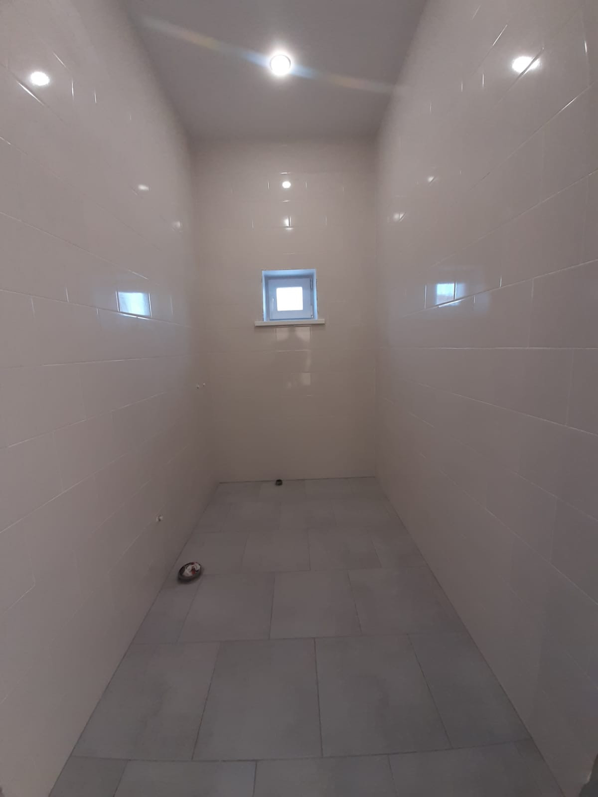 Натяжные потолки со встроенными светильниками,  ванная комната полностью выложена плиткой.
