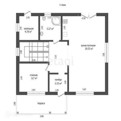 На первом этаже кухня-гостиная, комната под офис или гостевая, санузел.