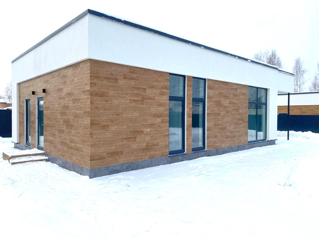 Утепление стен выполнено пенополистиролом 50мм, внешняя отделка дома - штукатурка Ceresit и керамогранит, Кровля- имитация плоской - металлическая, утепление крыши минеральной ватой, общая толщина утеплителя 250мм.