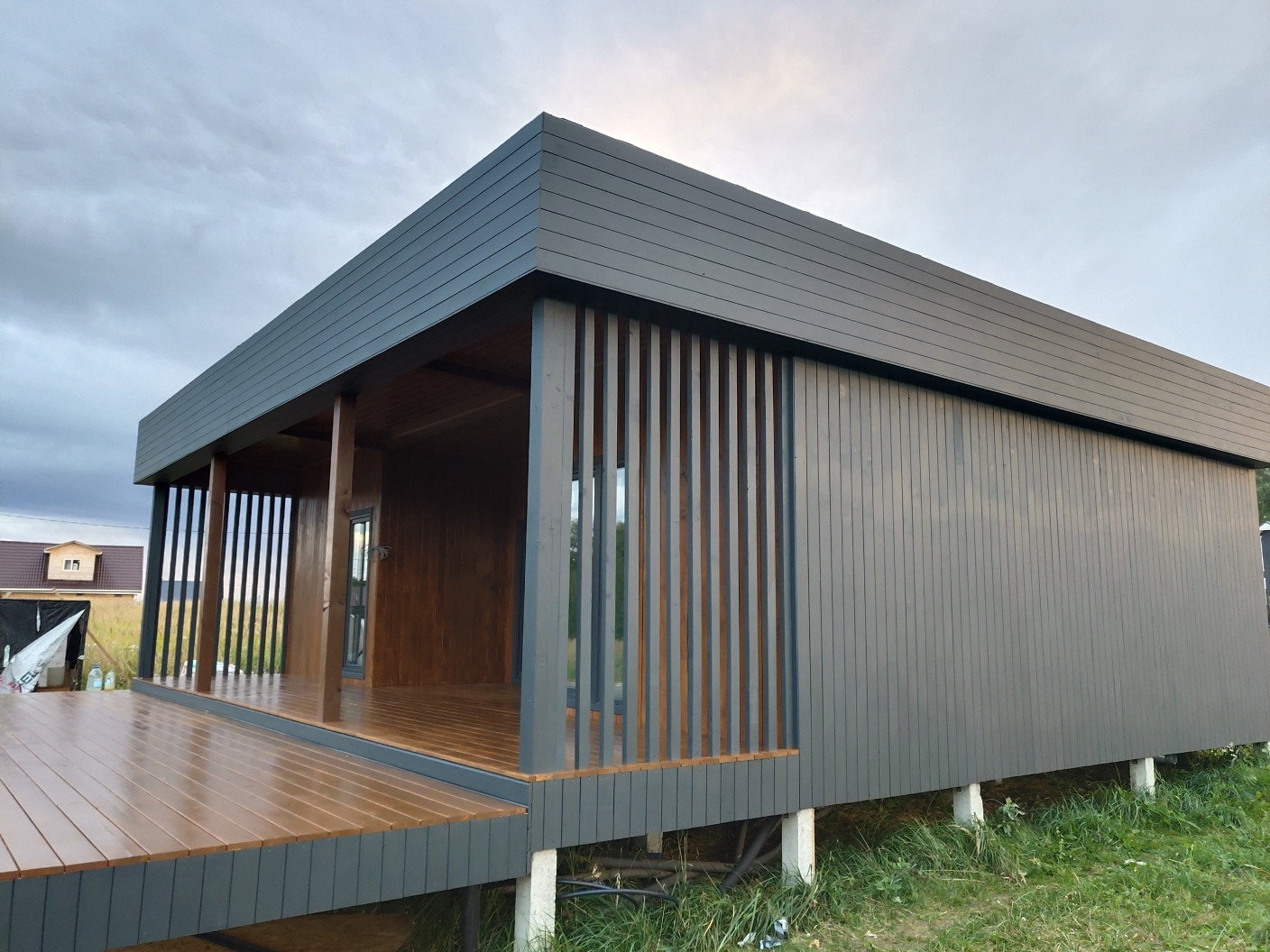 Дом каркасный из сухой строганой доски 40 мм, пол утепление 200 мм, крыша 200 мм, стены 150 мм минвата технониколь, фундамент забивные бетонные сваи, фасад - планкен АБ, окна в пол 70 профиль с ламинацией антрацит. Терраса и патио из лиственицы сорт АБ. Все на скрытом крепже, без гвоздей!