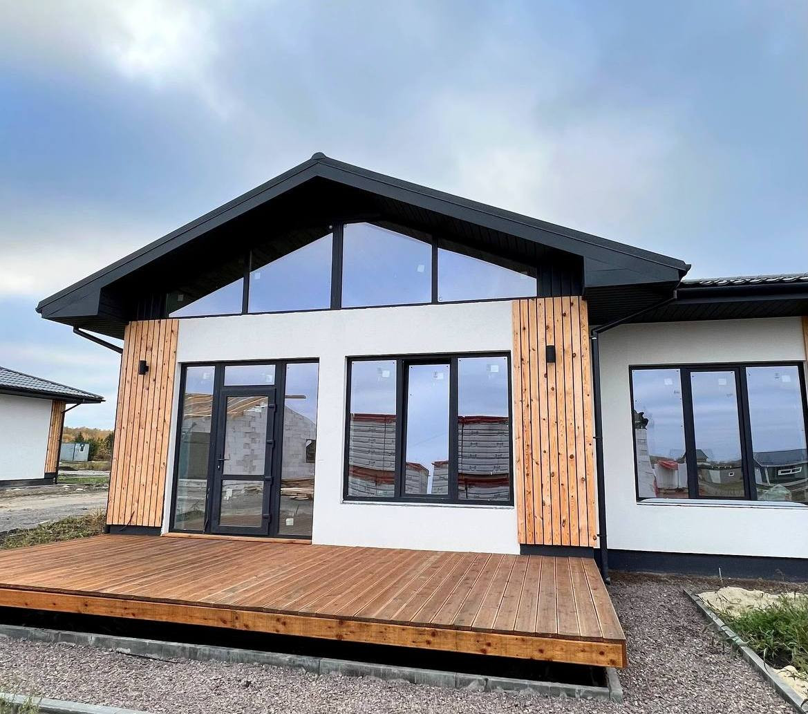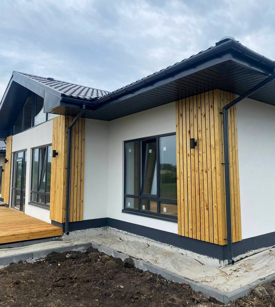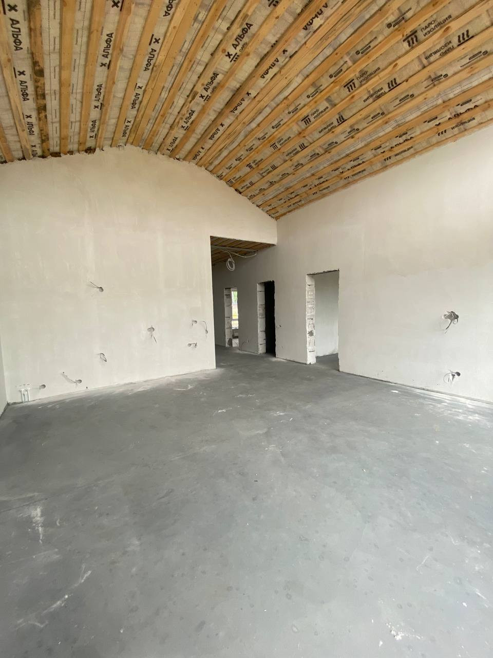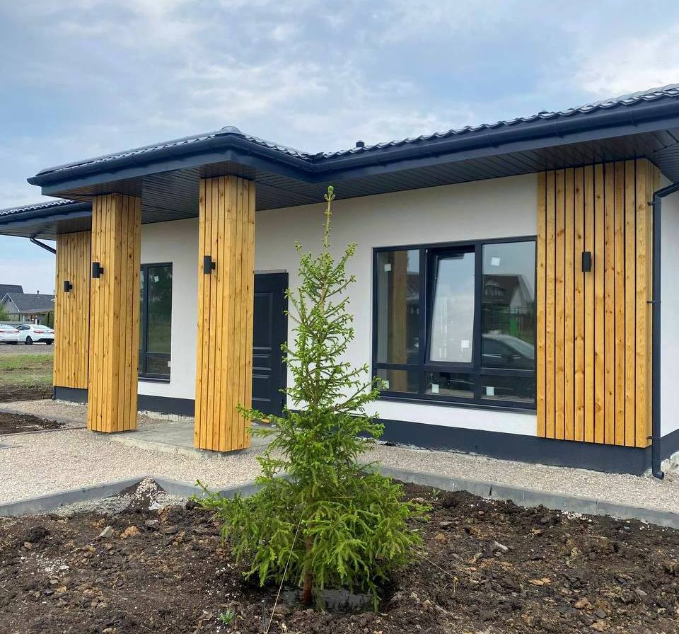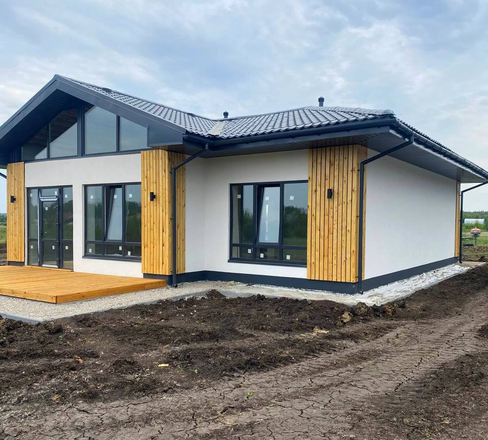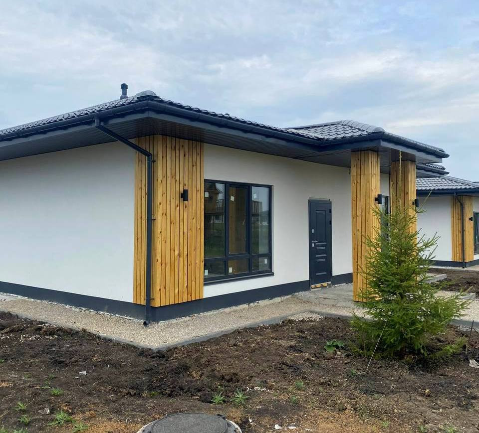 В доме расположилась просторная кухня-гостиная со вторым светом и с выходом на большую террасу, 3 спальни, большой санузел и котельная.