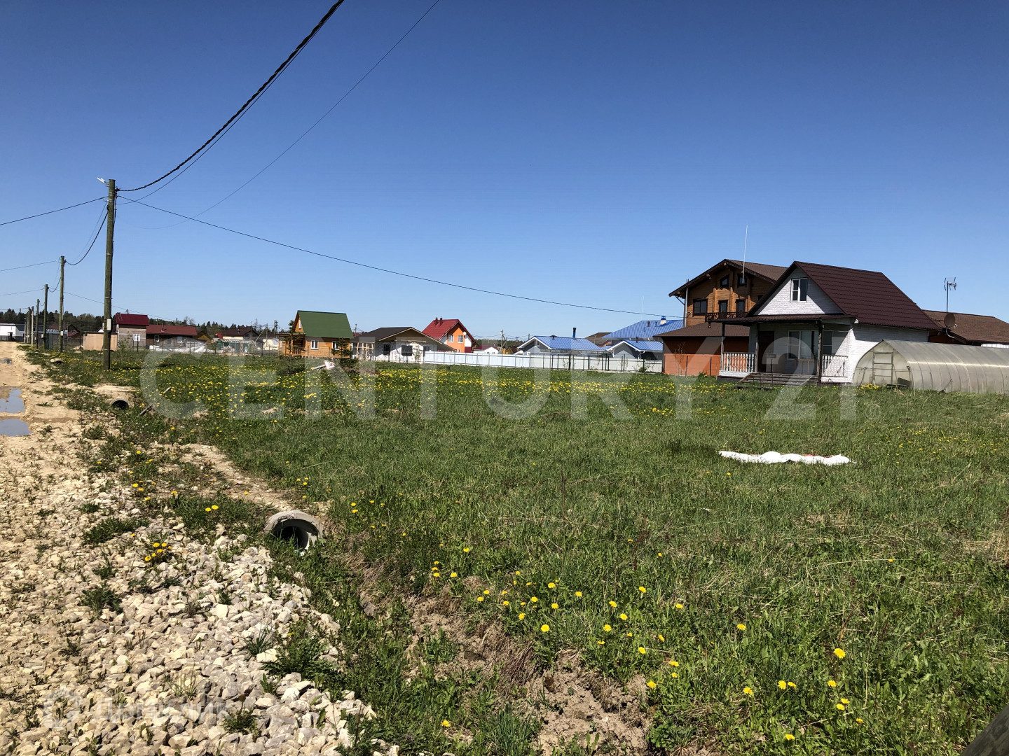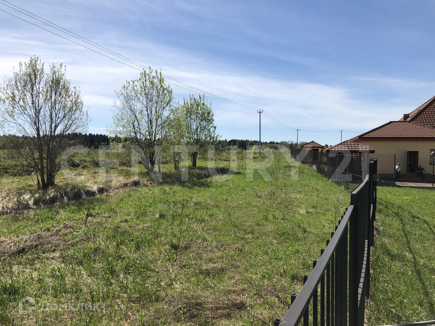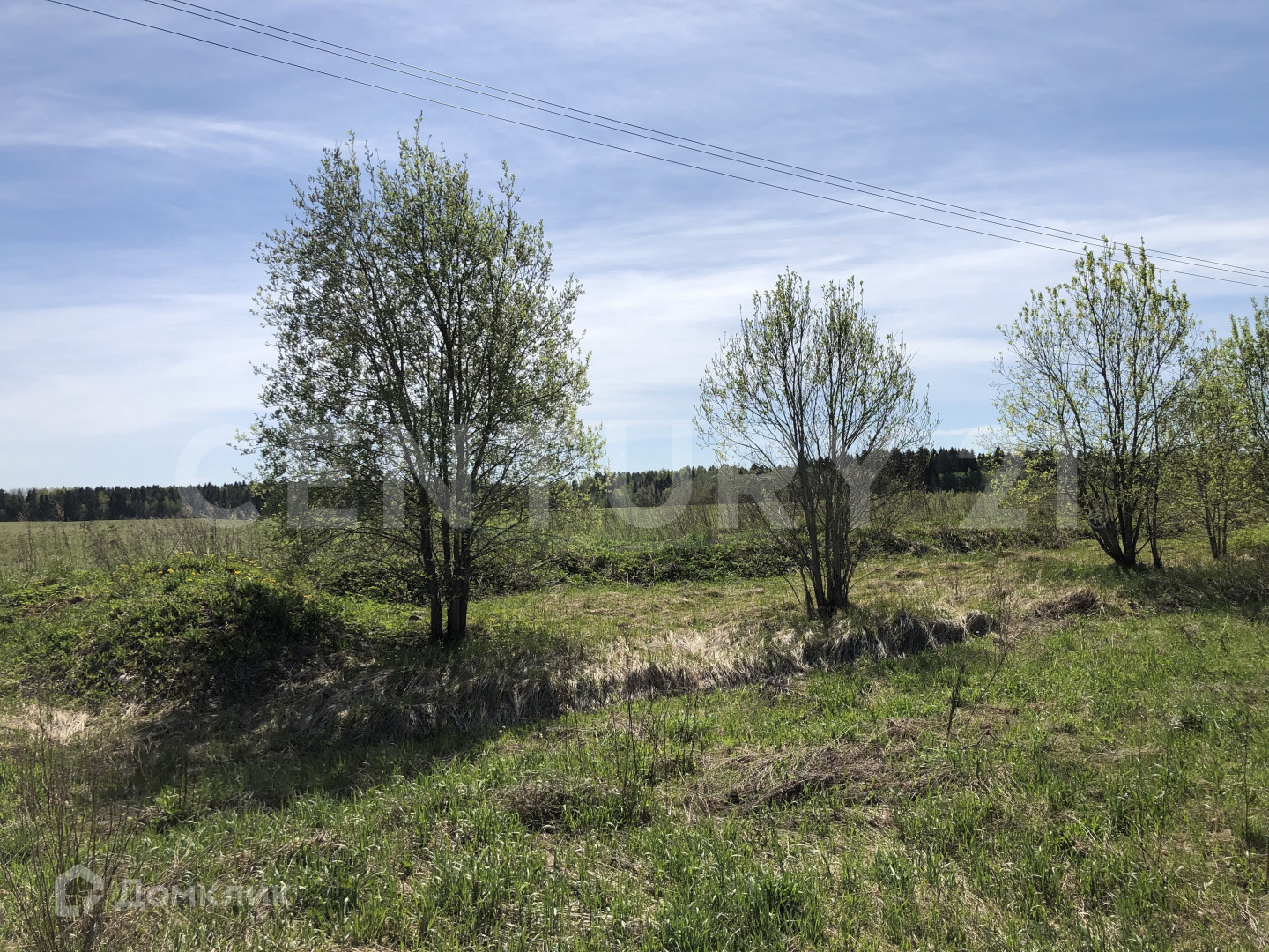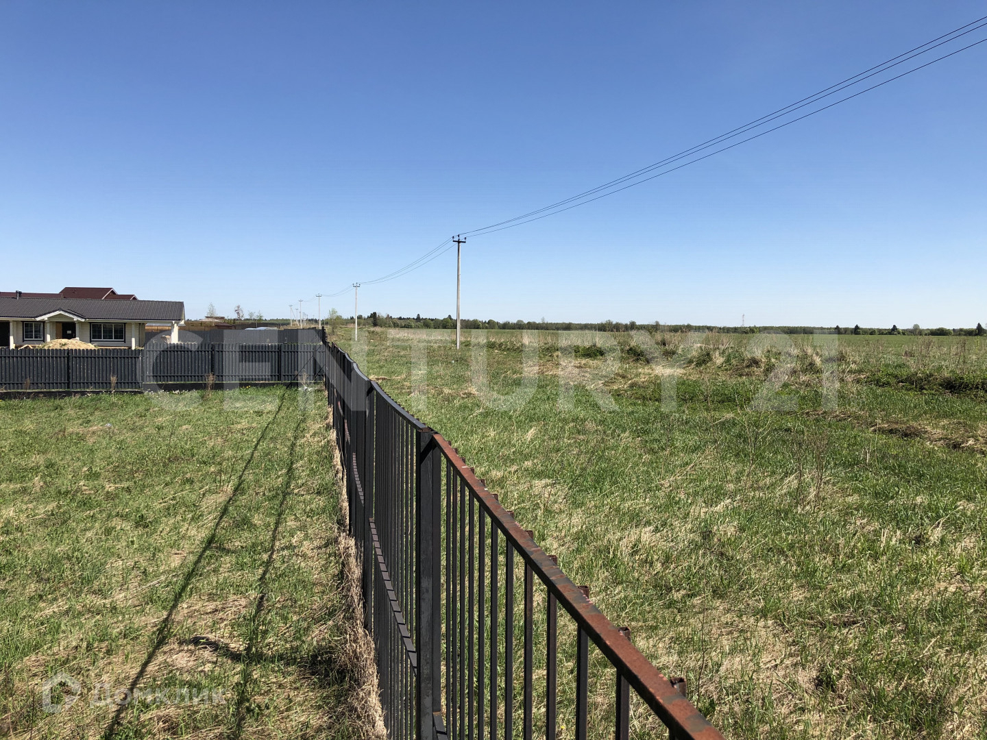 Сухой, ровный участок на краю посёлка, вид на поле и лес, выровнен и ухожен.