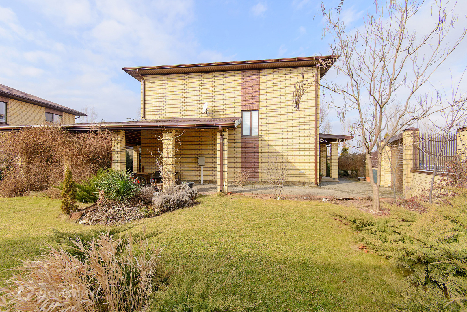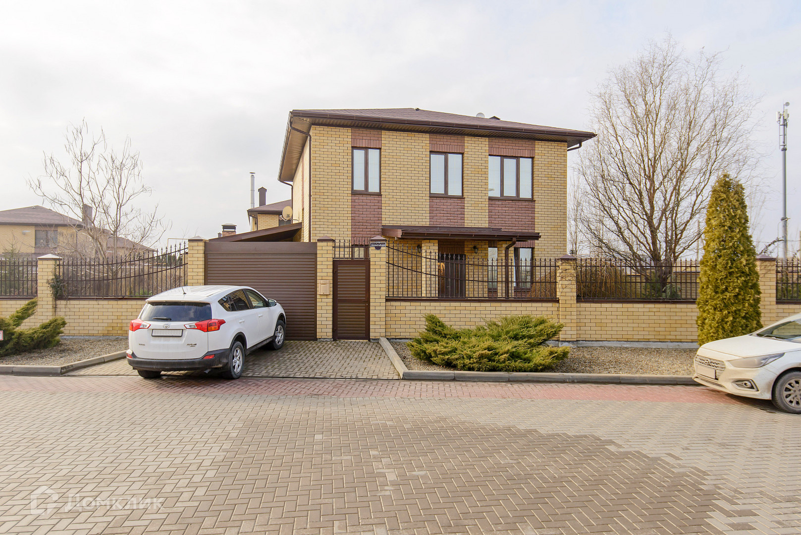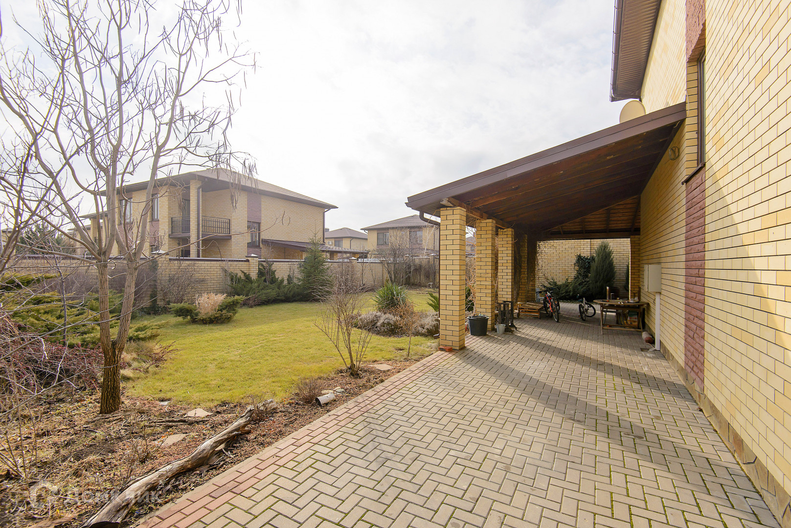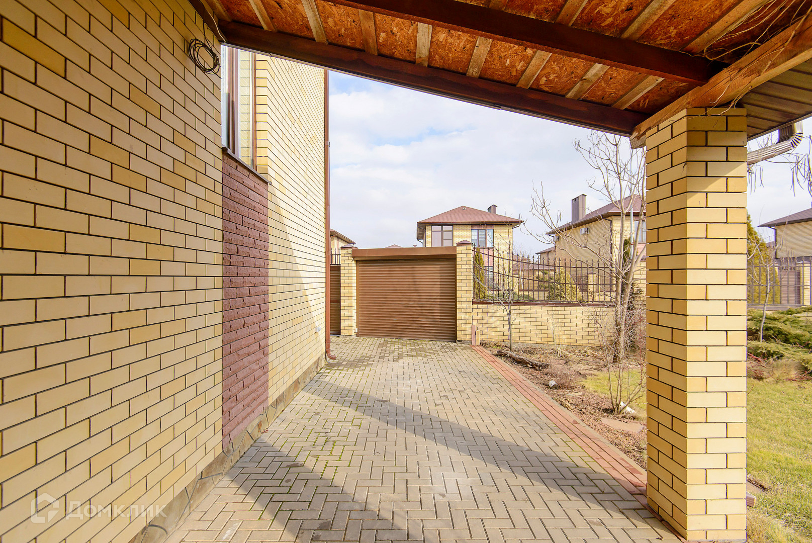Большой участок 6.14 сотки. Навес. Качественный кирпичный забор, ролл-ворота. Двор выложен плиткой. Ландшафтный дизайн. Вся территория посёлка «Донской» выложена тротуарной плиткой.