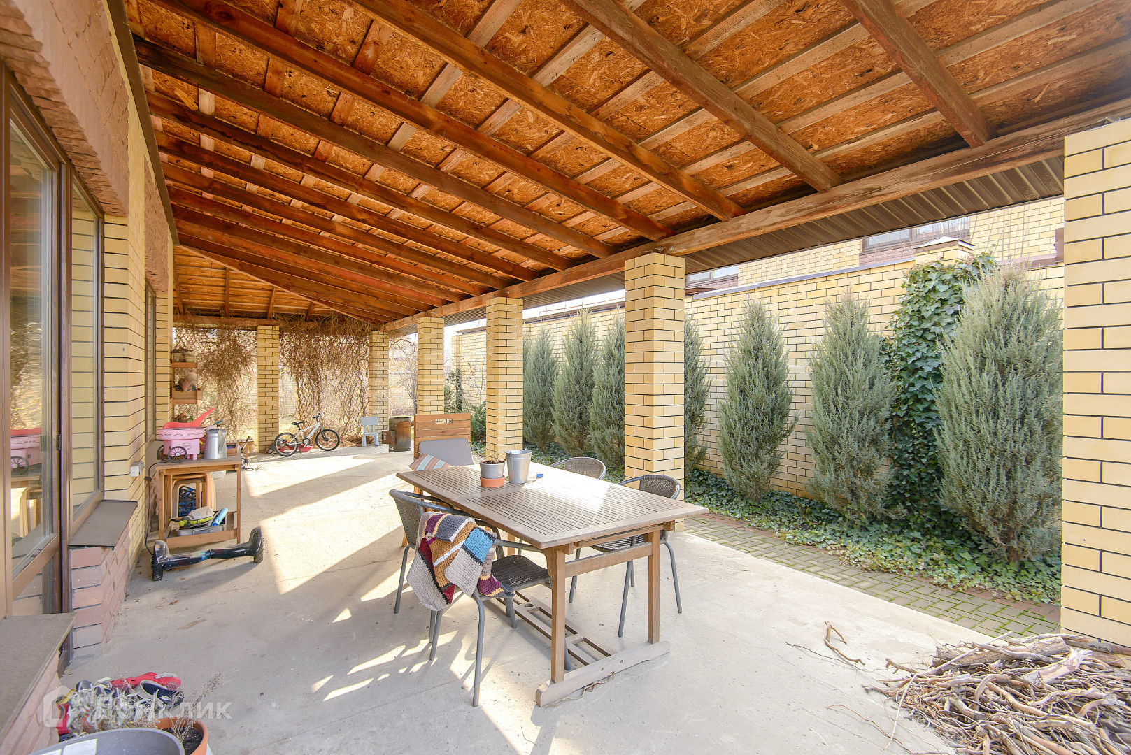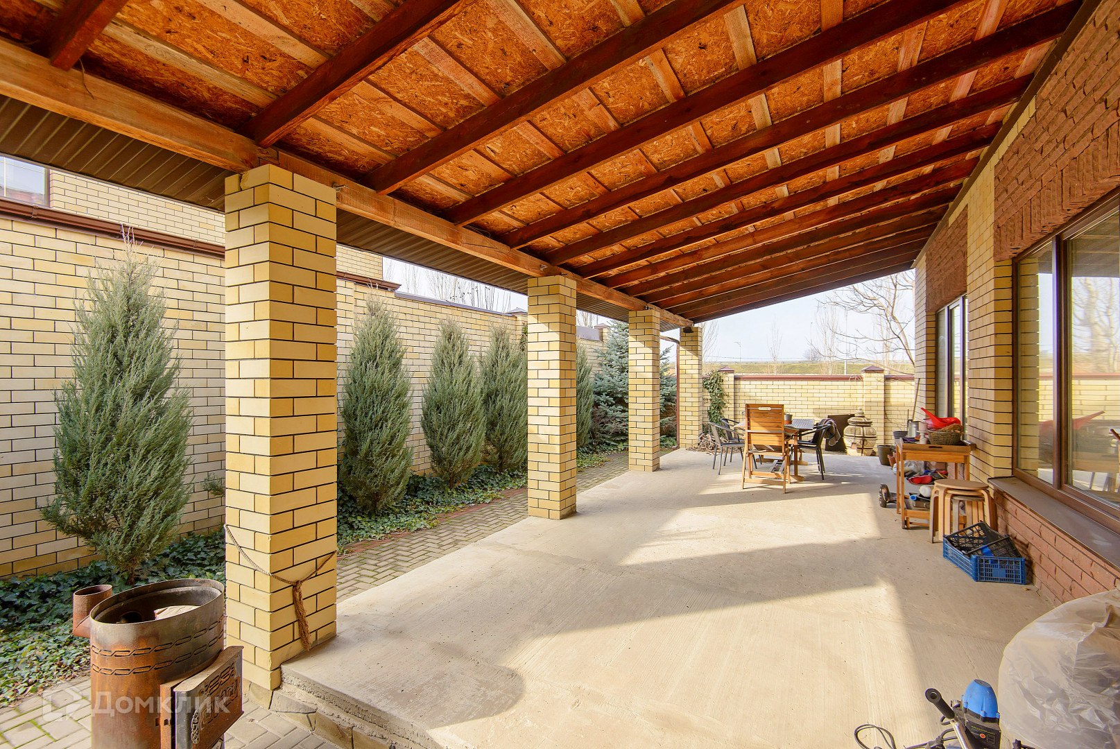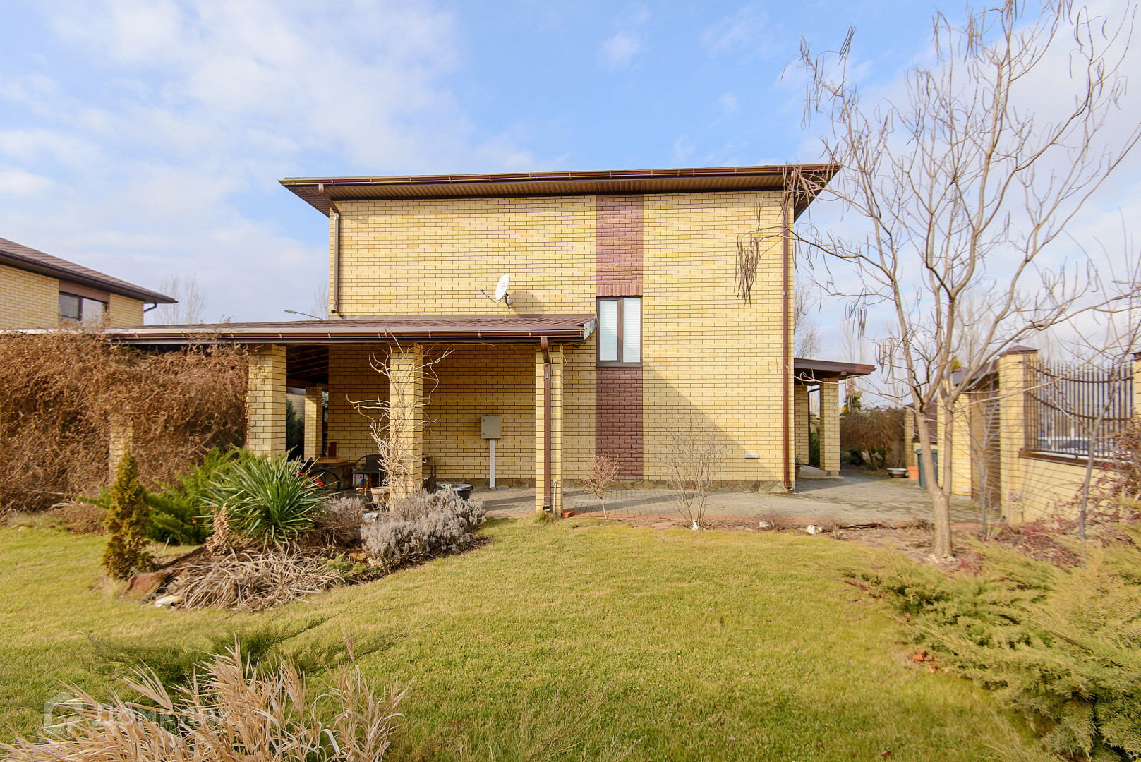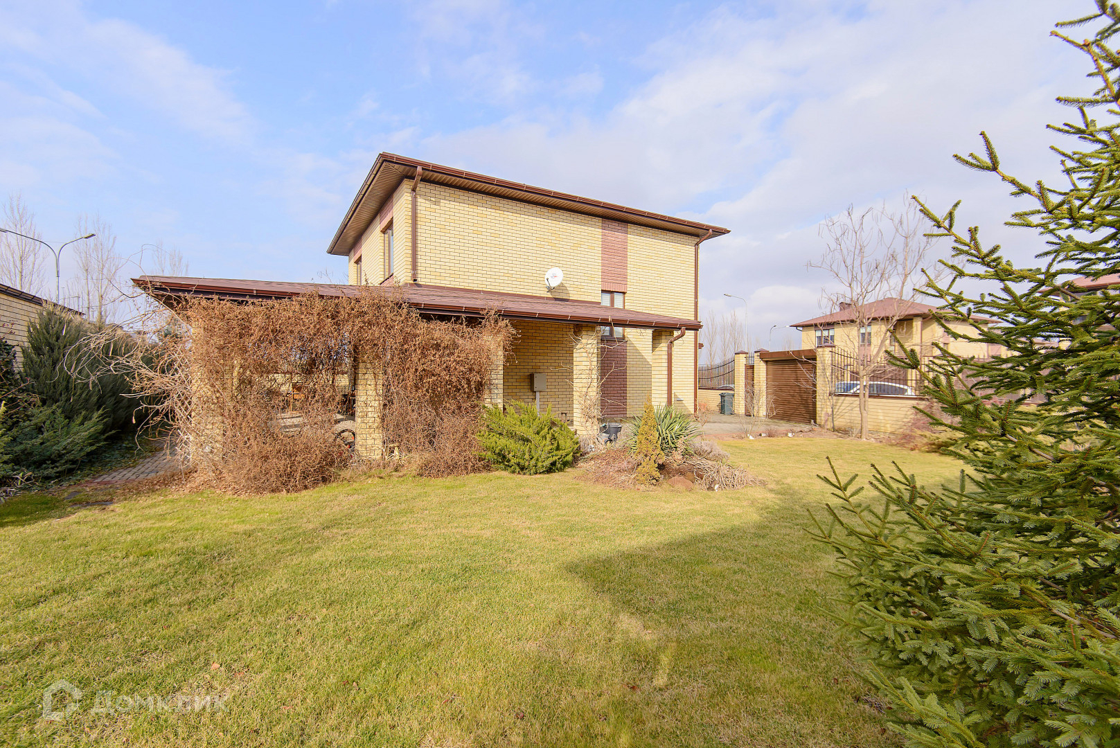 Большой участок 6.14 сотки. Навес. Качественный кирпичный забор, ролл-ворота. Двор выложен плиткой. Ландшафтный дизайн. Вся территория посёлка «Донской» выложена тротуарной плиткой.
