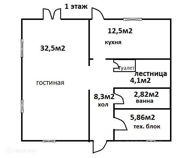На 1 этаже - 1 большая гостиная, кухня (12,5м2) просторная, ванная, туалет, и хоз. блок!