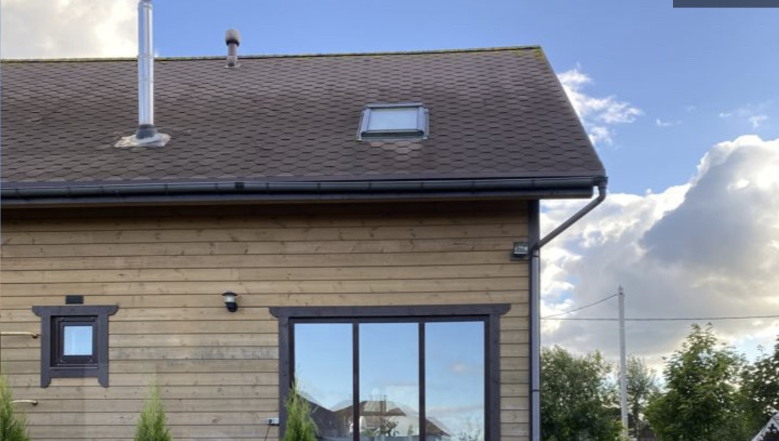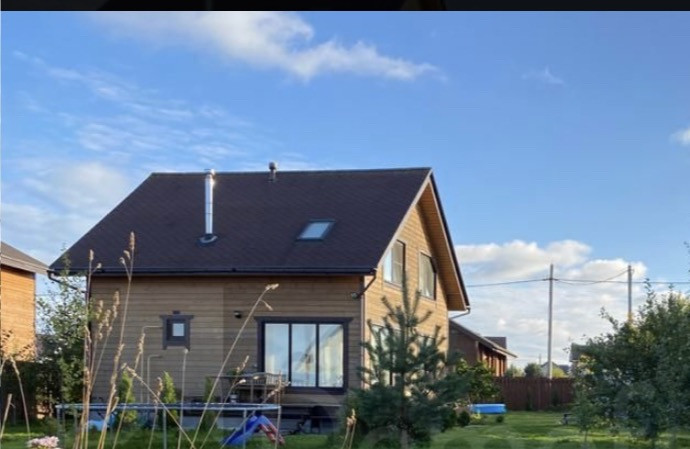 Дом построен по каркасной технологии на свайно-винтовом фундаменте. С учетом всех современных норм и технологий. Каркас дома возведен из сухой строганной доски камерной сушки. Снаружи дом облицован имитатором бруса 35х150 мм. Крыша покрыта гибкой битумной черепицей Шинглас. Утепление контура минеральная вата Rockwool, 150 мм в стенах, 200 мм в крыше и полу дома. Двухкамерные окна Rehau и 2 мансардных окна Velux. Разводка водопровода и отопления сделана из металлопластиковых труб Henko.