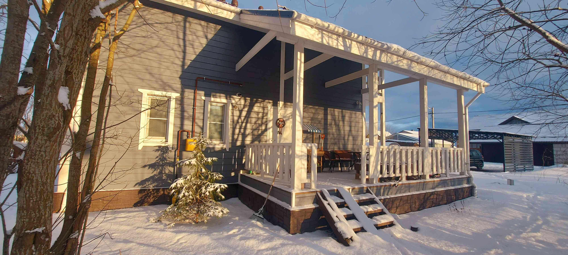 На участке: парник с микрополивом, бытовка, навес на 2 машины, мангальная зона.
