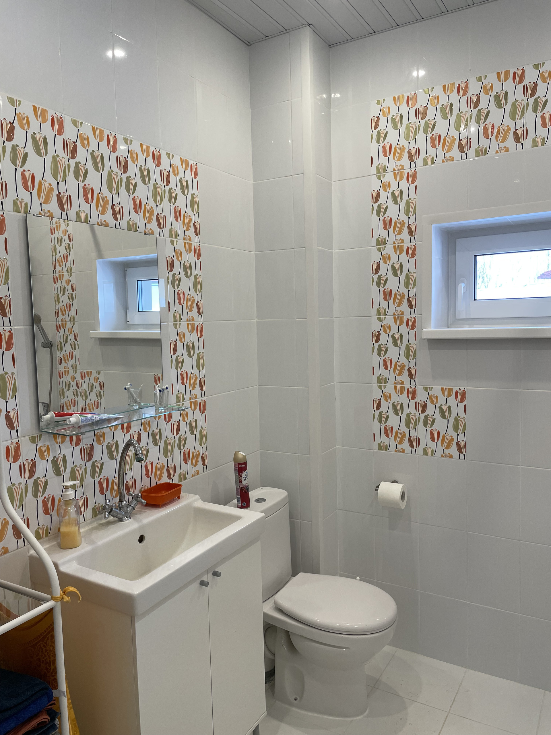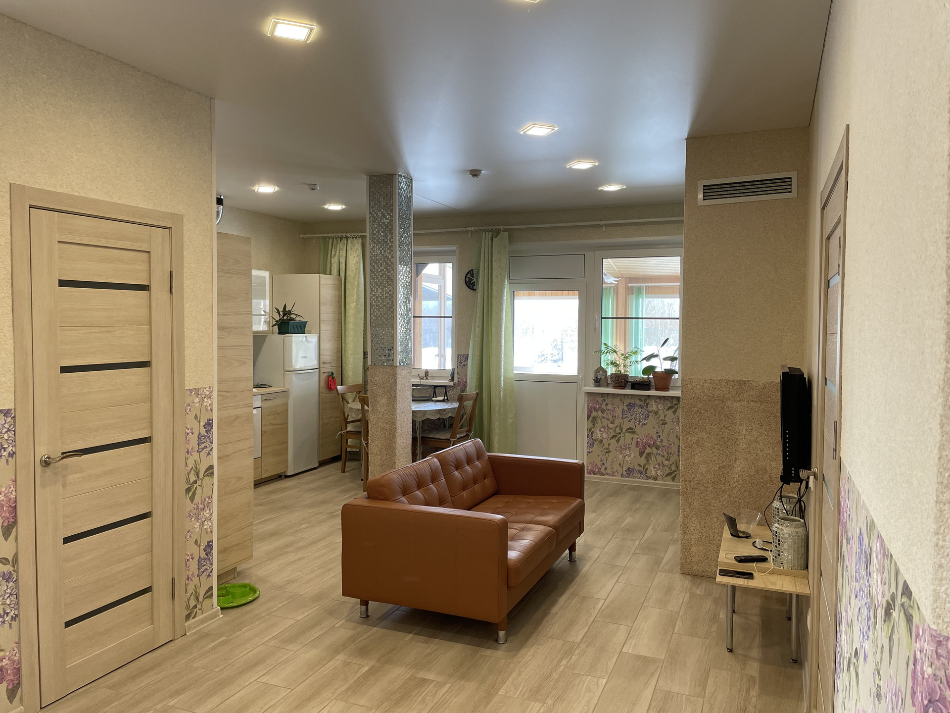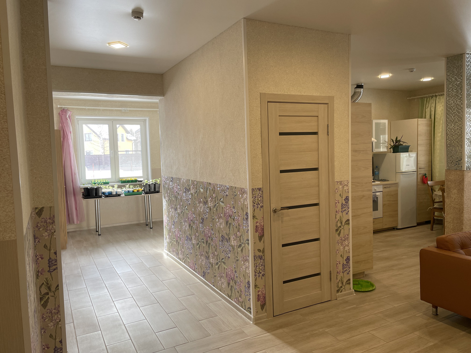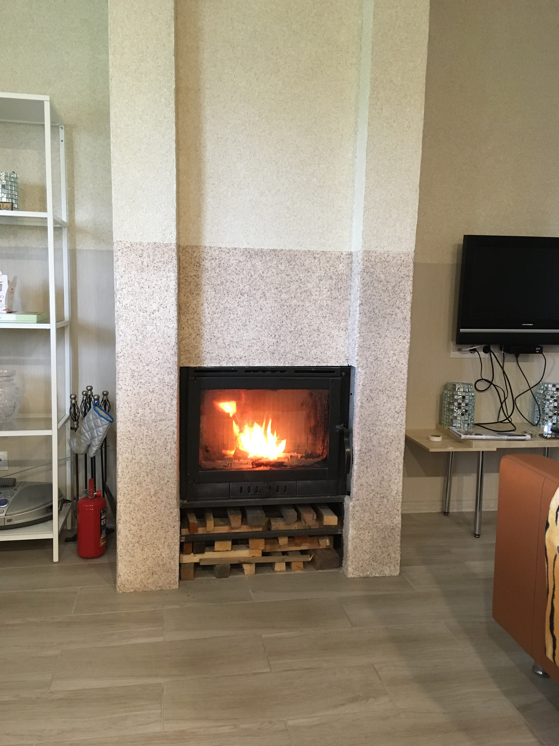 Водяные теплые полы (полусухая цементная стяжка + керамогранитная плитка). Камин.